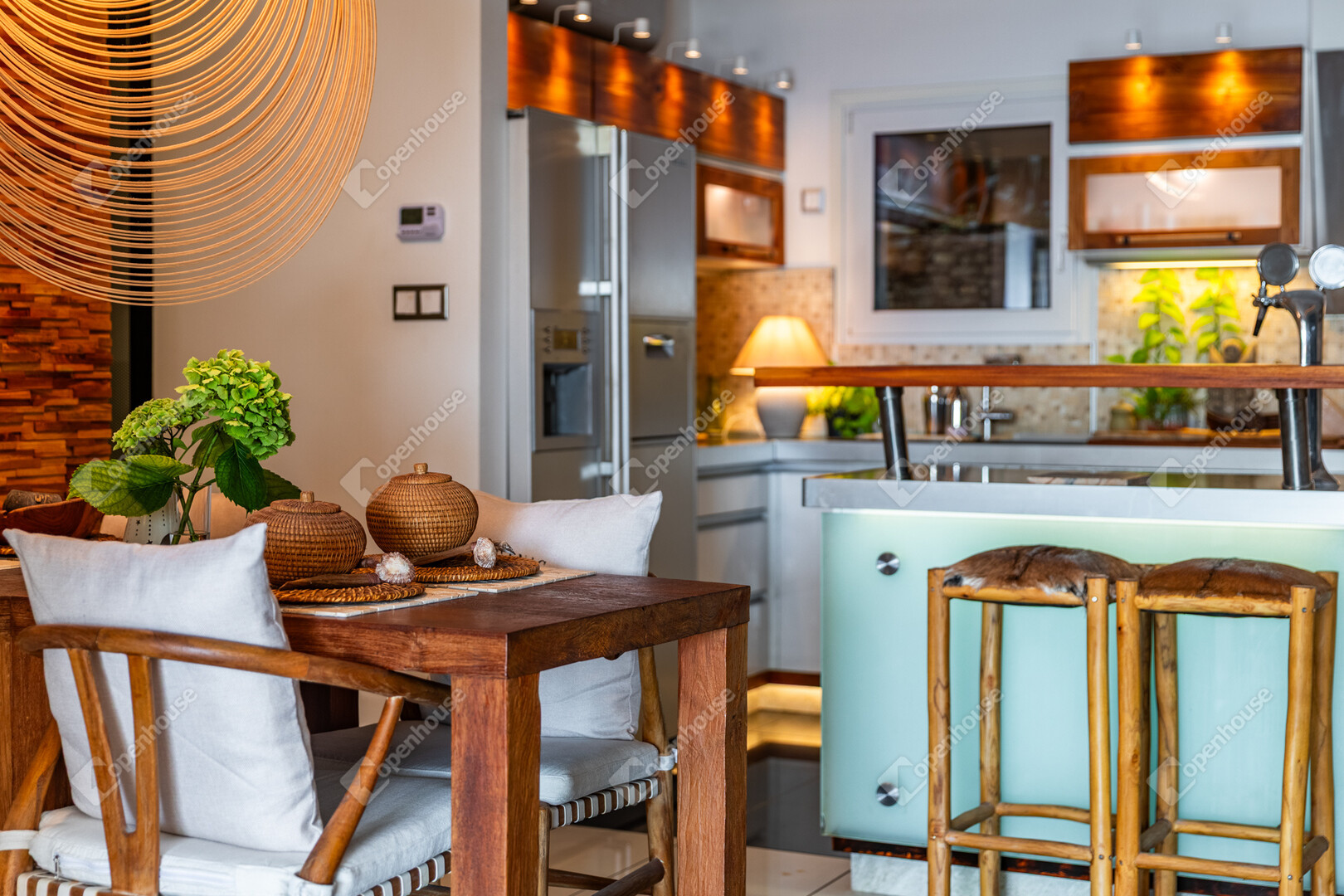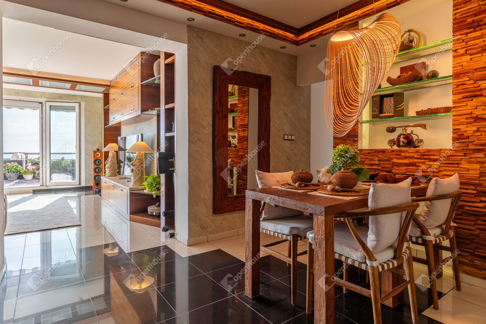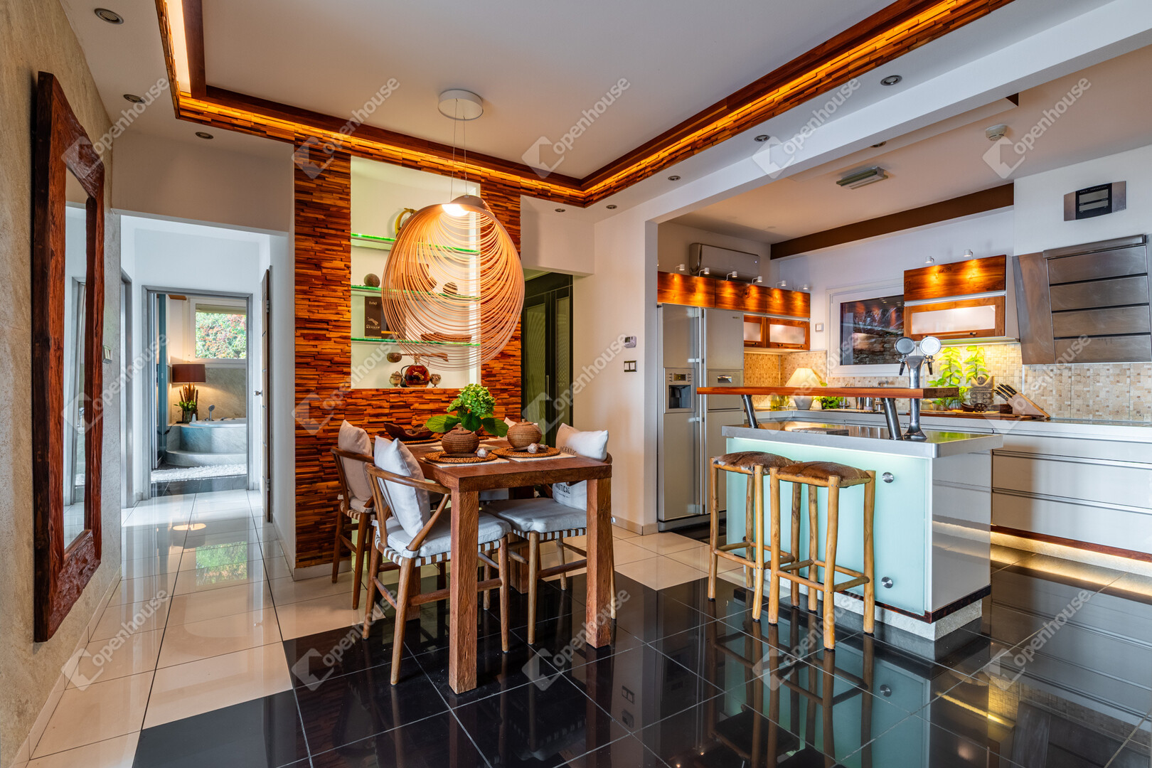 A nappali közvetlen folytatásaként tárul fel az étkező és a konyha, amely egyszerre modern és otthonos. Az üveg- és faelemek, a fényben úszó munkafelületek és a bárpult köré szervezett közösségi tér ideális helyszíne a hétköznapok laza beszélgetéseinek és a baráti összejöveteleknek. Minden egyes részlet – a függesztett designlámpától a falfülkékben sorakozó dekorációkig – arról szól, hogy a tér egyszerre praktikus és meghitt.