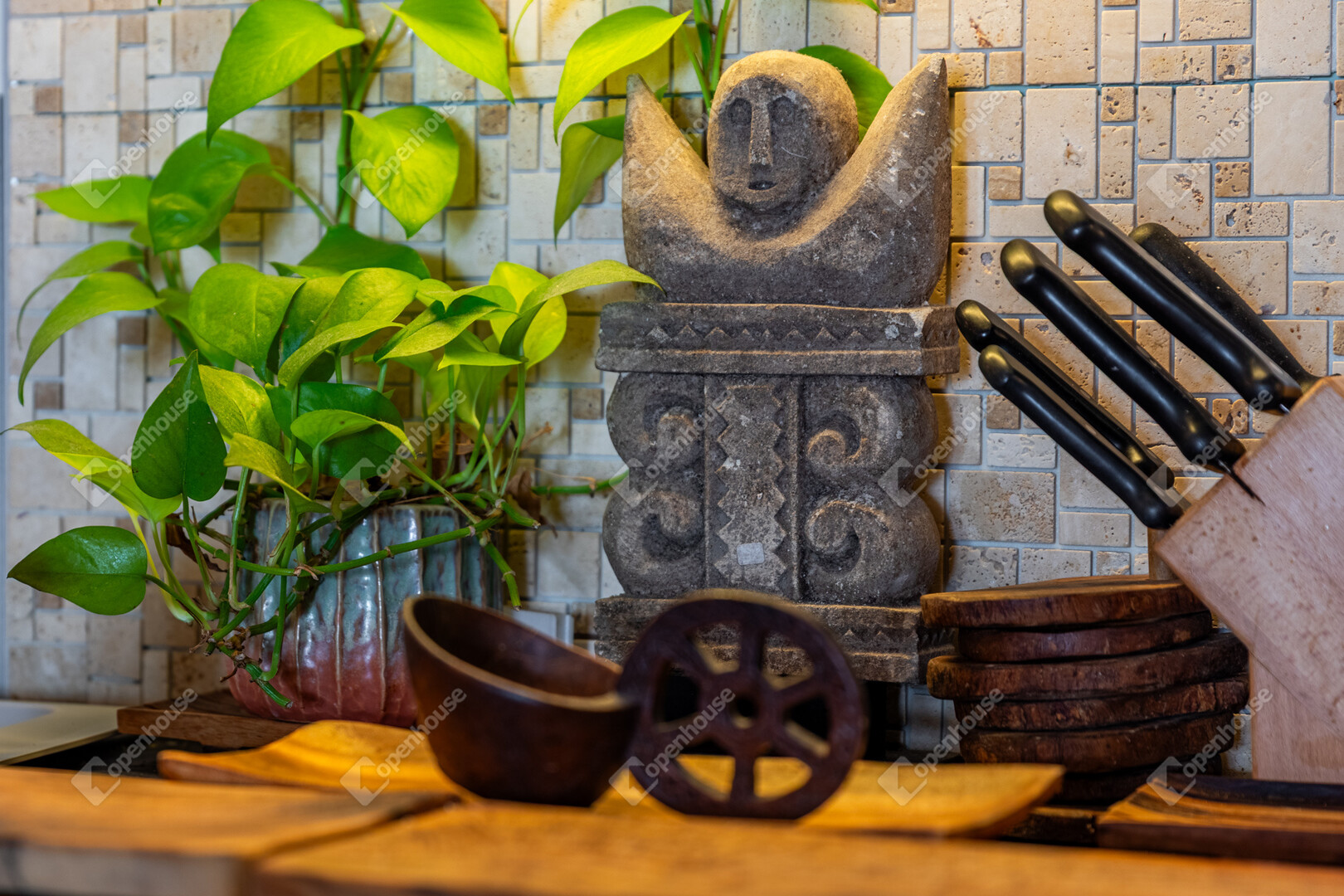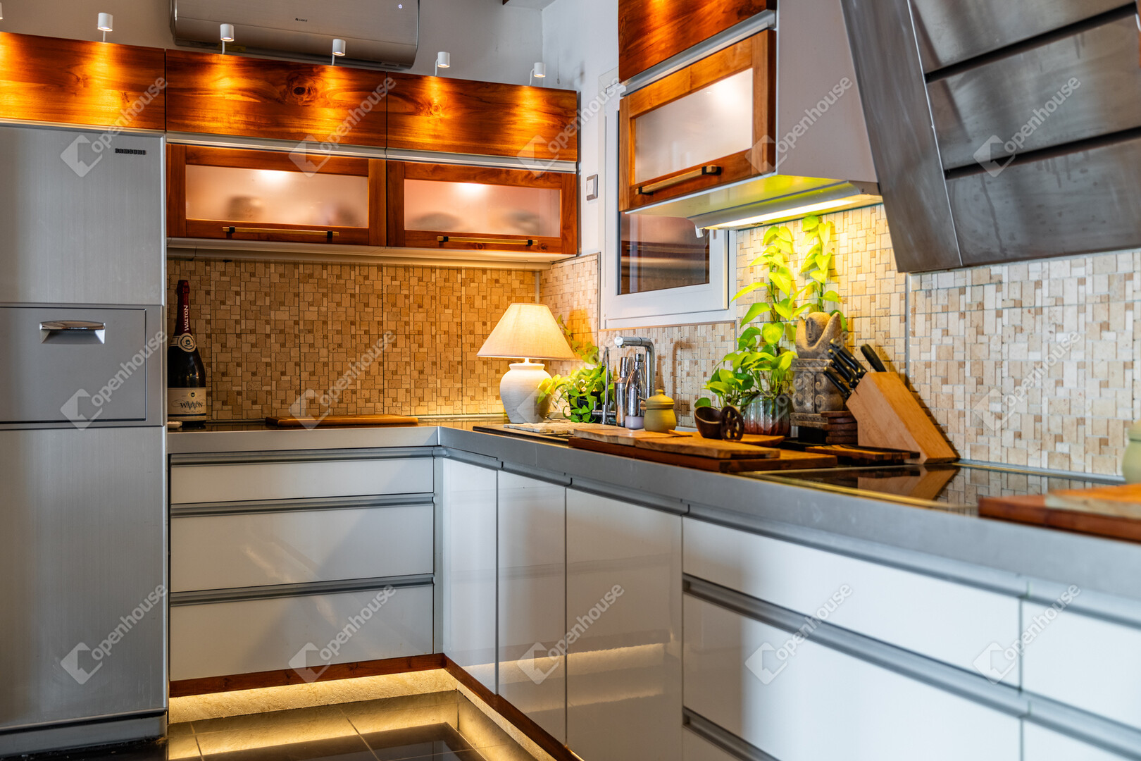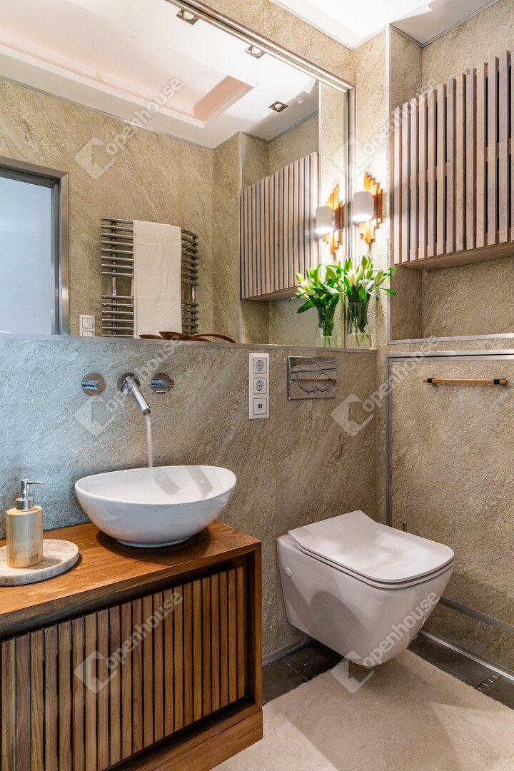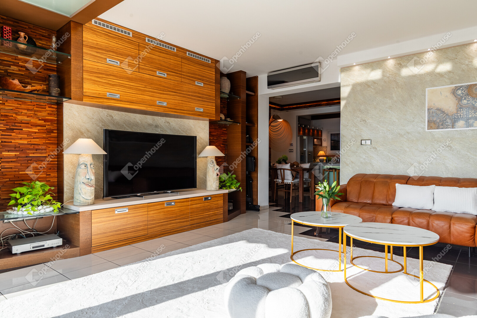 A lakás hangulatát a természetes anyagok és a fények játéka határozza meg. A meleg fa burkolatok, a falakon végigfutó kőtextúrák és a rejtett világítások együtt hozzák létre azt a keleties, bensőséges atmoszférát, ahol minden apró részlet nyugalmat sugároz. Ez a letisztultság és melegség egyszerre teszi különlegessé és élhetővé az otthont.