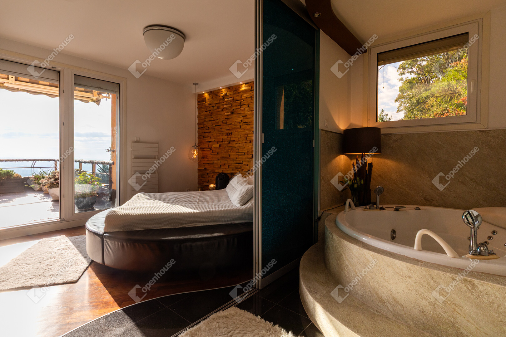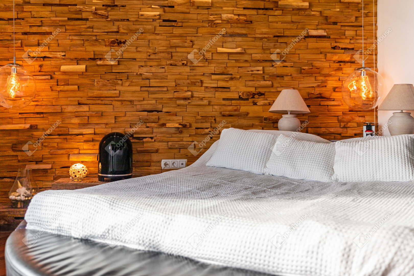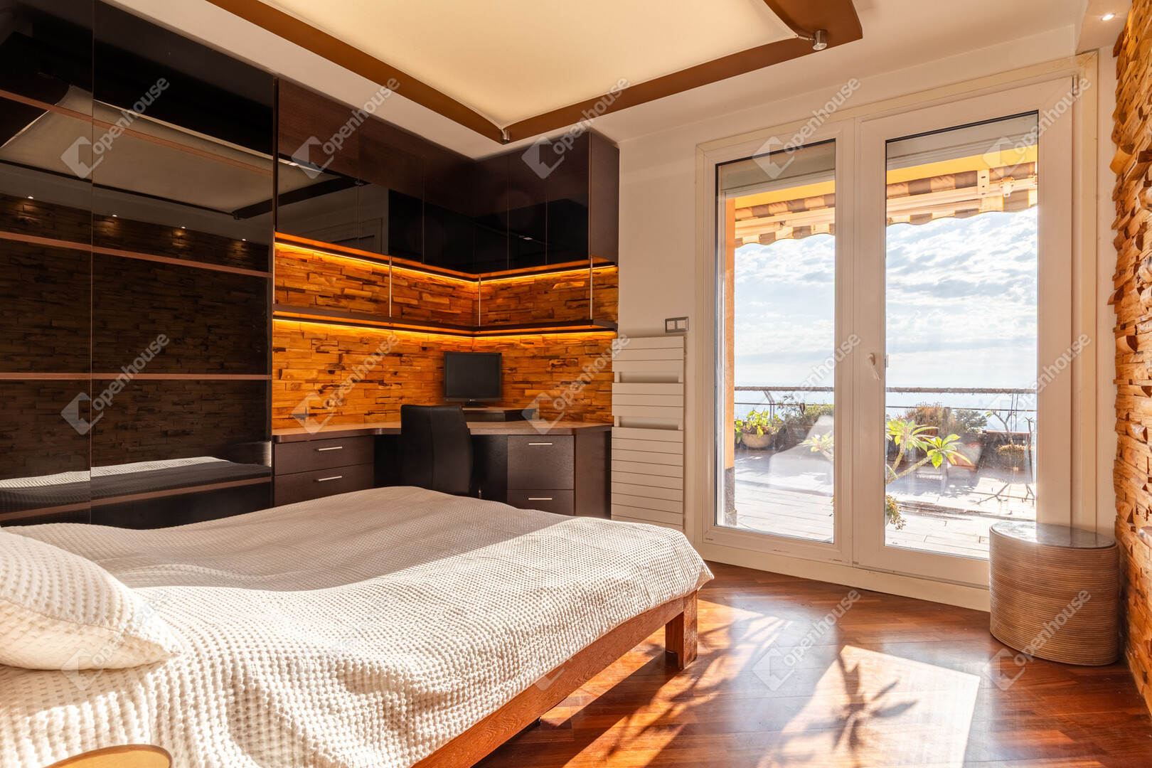 A hálószobákban folytatódik ez a hangulat: a közvetlen teraszkijáratnak köszönhetően a reggeli fény átszűrődik a hatalmas üvegfelületeken, és a város panorámája már az első pillantásra az új nap része lesz. A falakon futó fa burkolatok melegséget árasztanak, az egyedi beépített megoldások pedig harmóniát és intimitást teremtenek – ezek a terek egyszerre alkalmasak pihenésre, munkára és elvonulásra.