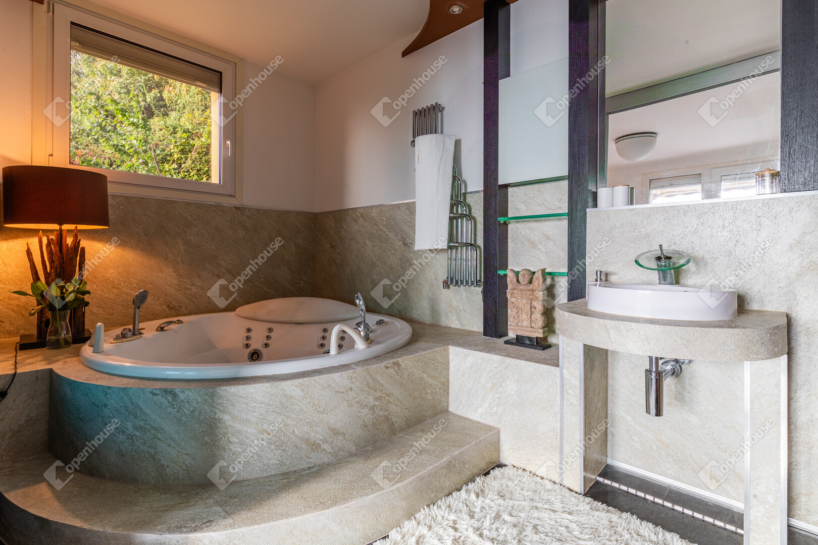 A fürdőszoba valódi menedék, ahol a luxus kézzelfogható – nem hivalkodik, csak csendben van jelen. A központi helyen álló, prémium jacuzzi kád minden nap ünneppé teszi a pihenést, míg az esőztetővel és oldalzuhannyal felszerelt zuhanyban minden reggel egy személyre szabott spa-élménnyel indulhat a nap. A szauna és a szolárium kombinációja pedig teljessé teszi ezt a wellness-élményt, hogy a feltöltődés soha ne maradjon el.