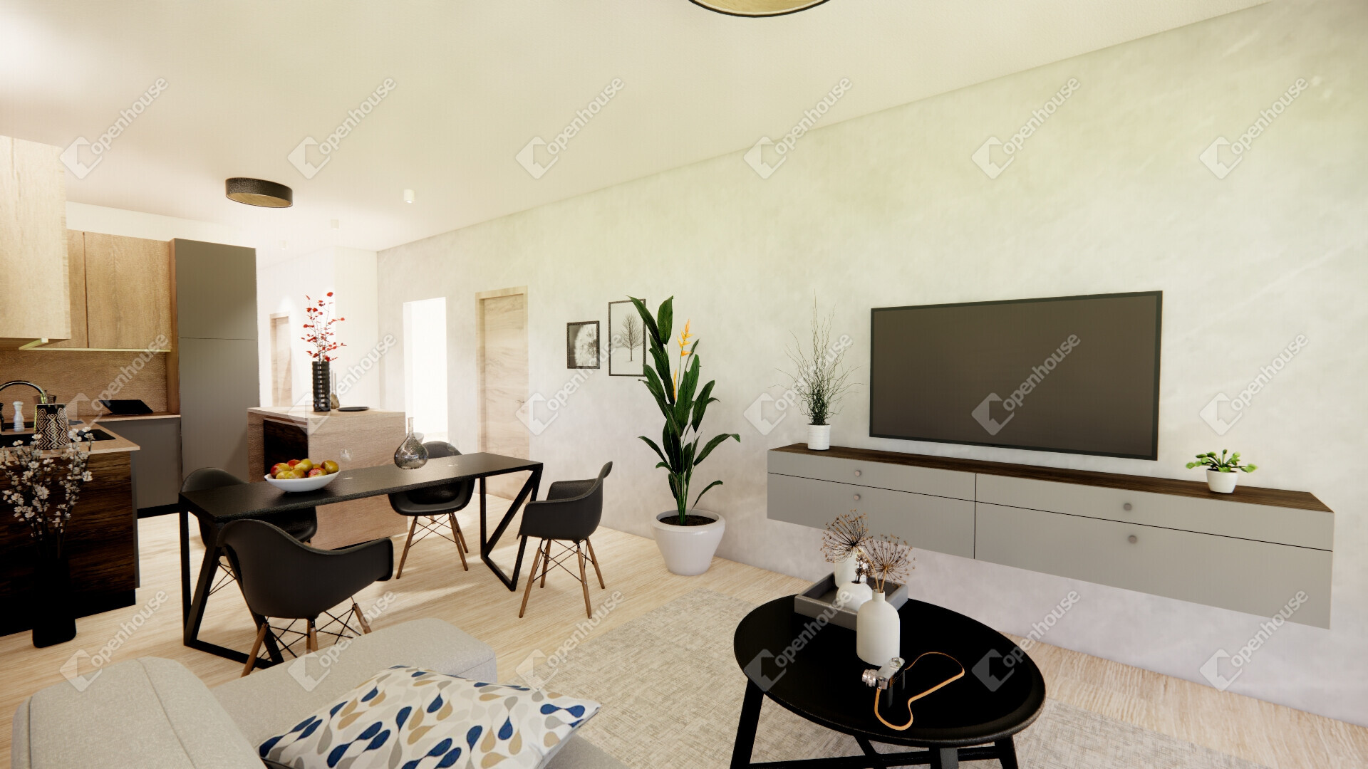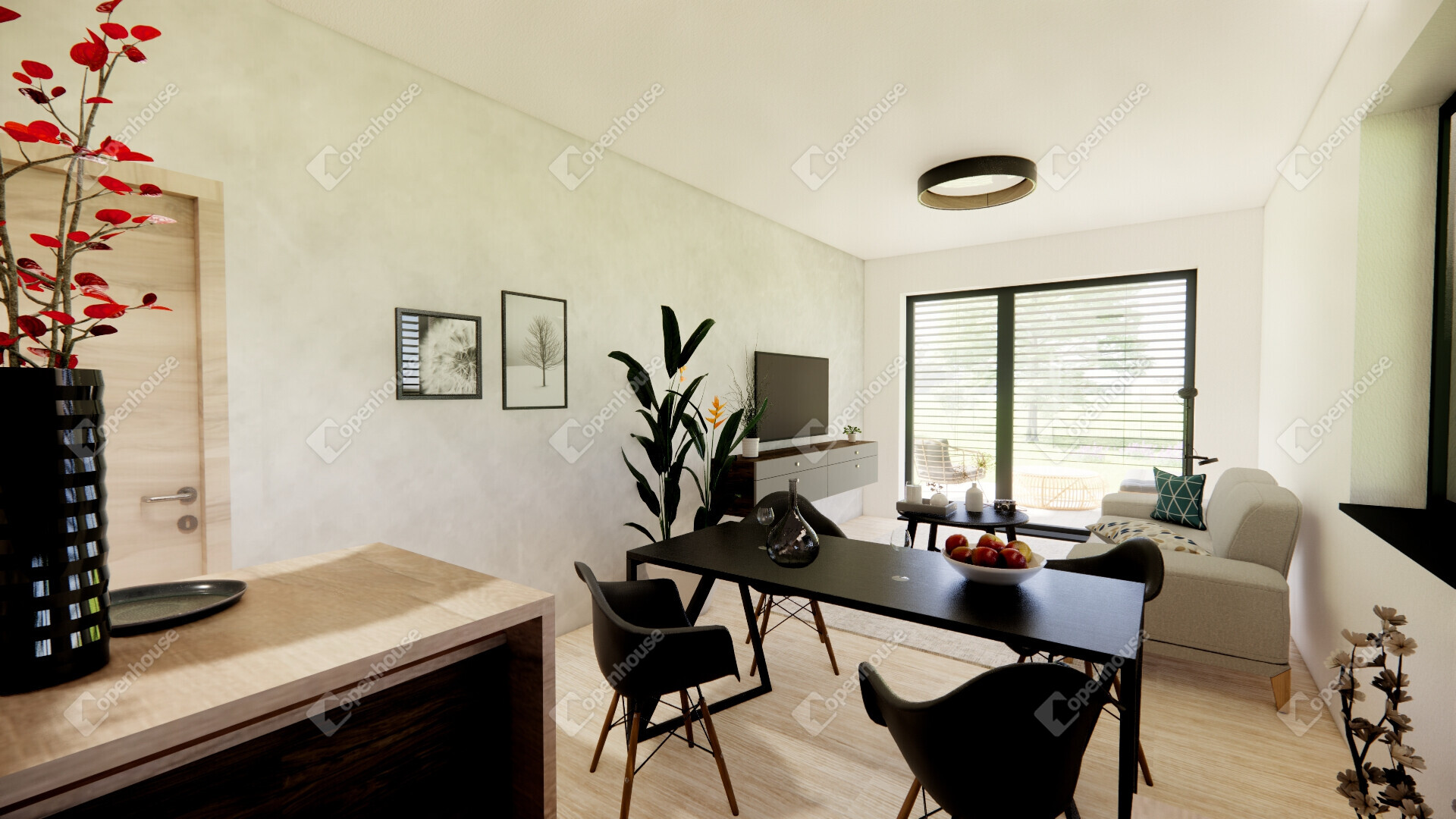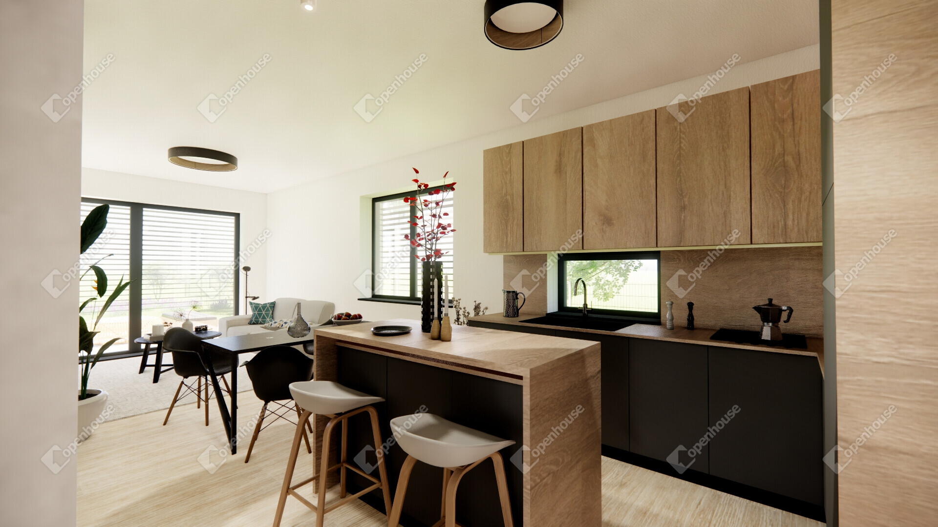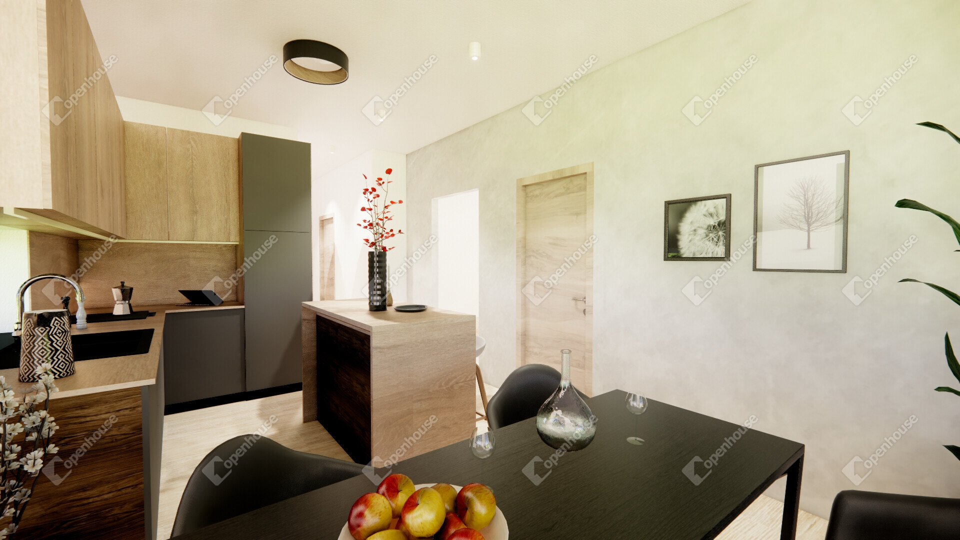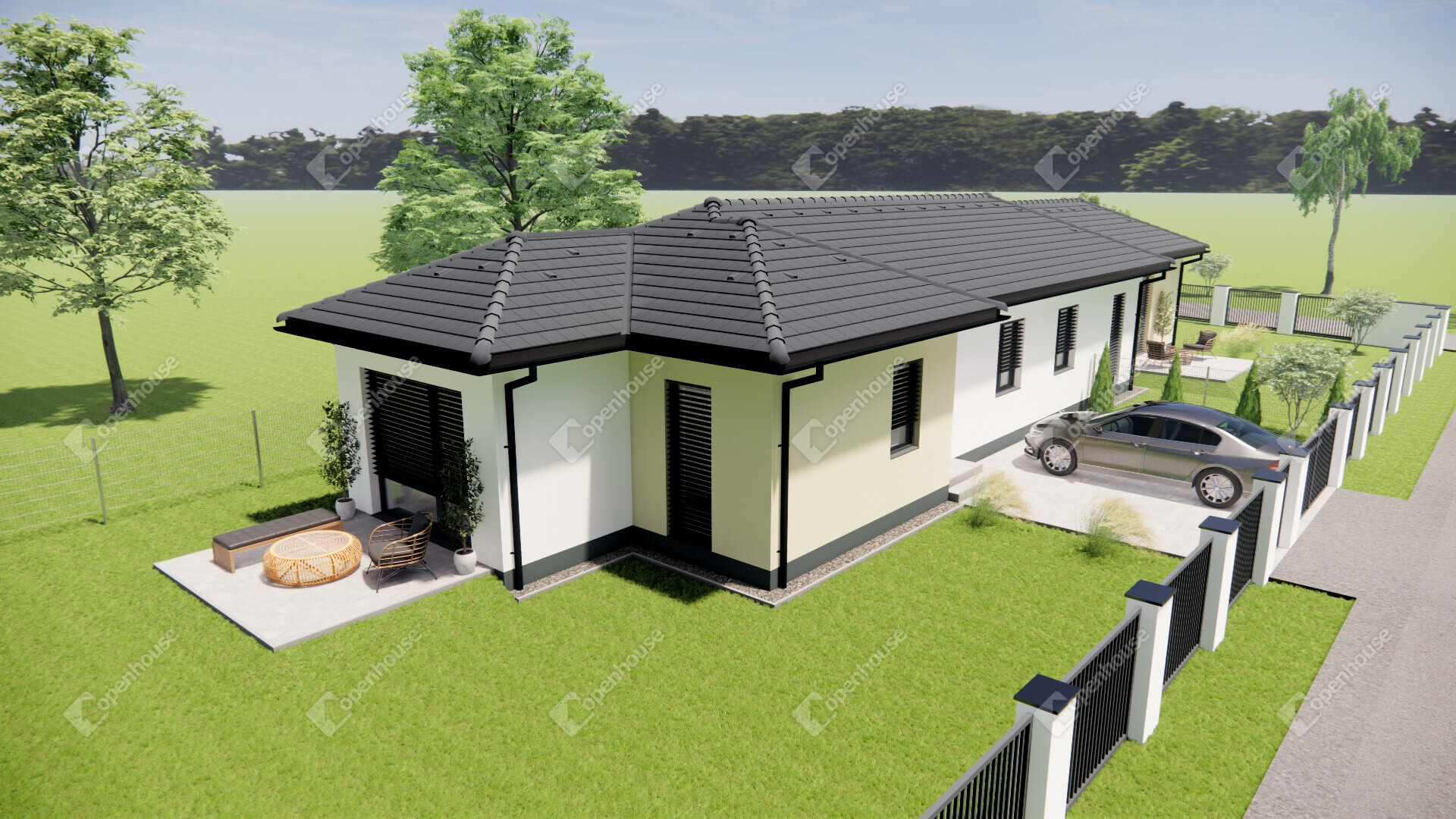 A földszintes ház elosztása a következő: amerikai konyha nappalival, étkezővel, 3 hálószoba, fürdőszoba WC-vel, külön WC, előtér, háztartási helyiség amelyben mosógép és hőszivattyú található, valamint közlekedő amelyből a helyiségek nyílnak.