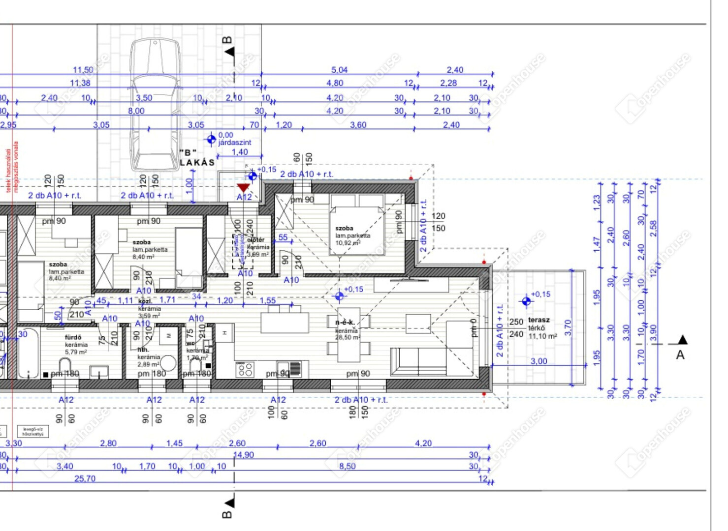 Falazat: A főfalak síkra csiszolt 30 N+F falazóelemből, ragasztóhabbal. Válaszfalak síkra csiszolt 10 -es téglából, ragasztóhabbal.