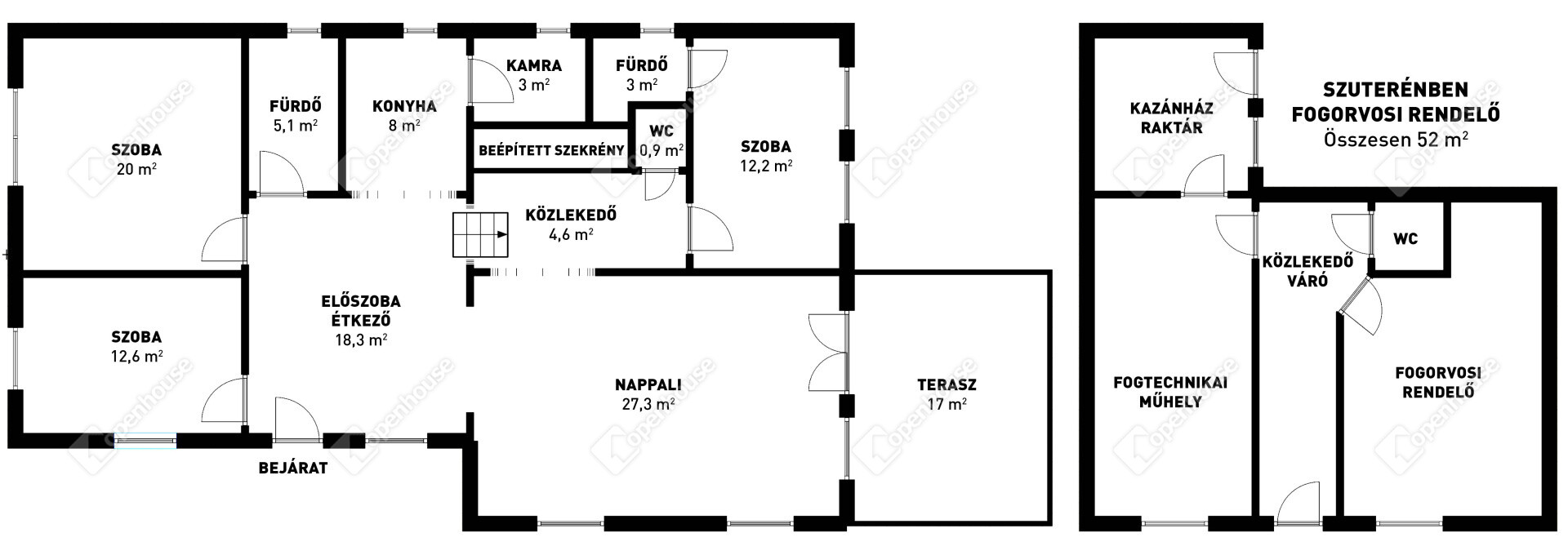 * A földszinten 135 nm. szinteltolásos családi lakótér + A szuterénben 52 nm.-es ablakos kialakítású, fűtött és vizesblokkal ellátott helyiségek, mely jelenleg fogorvosi rendelőként működik