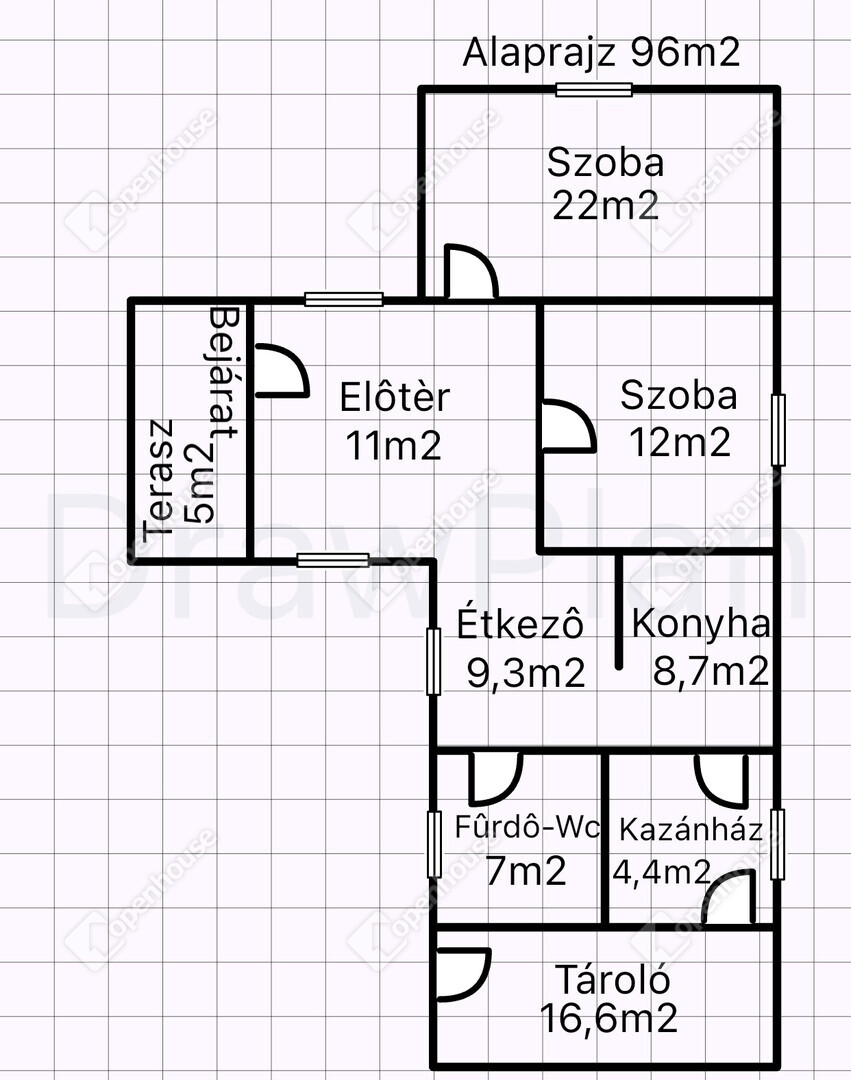 -Helyiségek 96m2 alapterületen: kettő szoba, előtér, fürdő-wc, konyha, étkező ,kazánház, tároló helyiség, terasz.