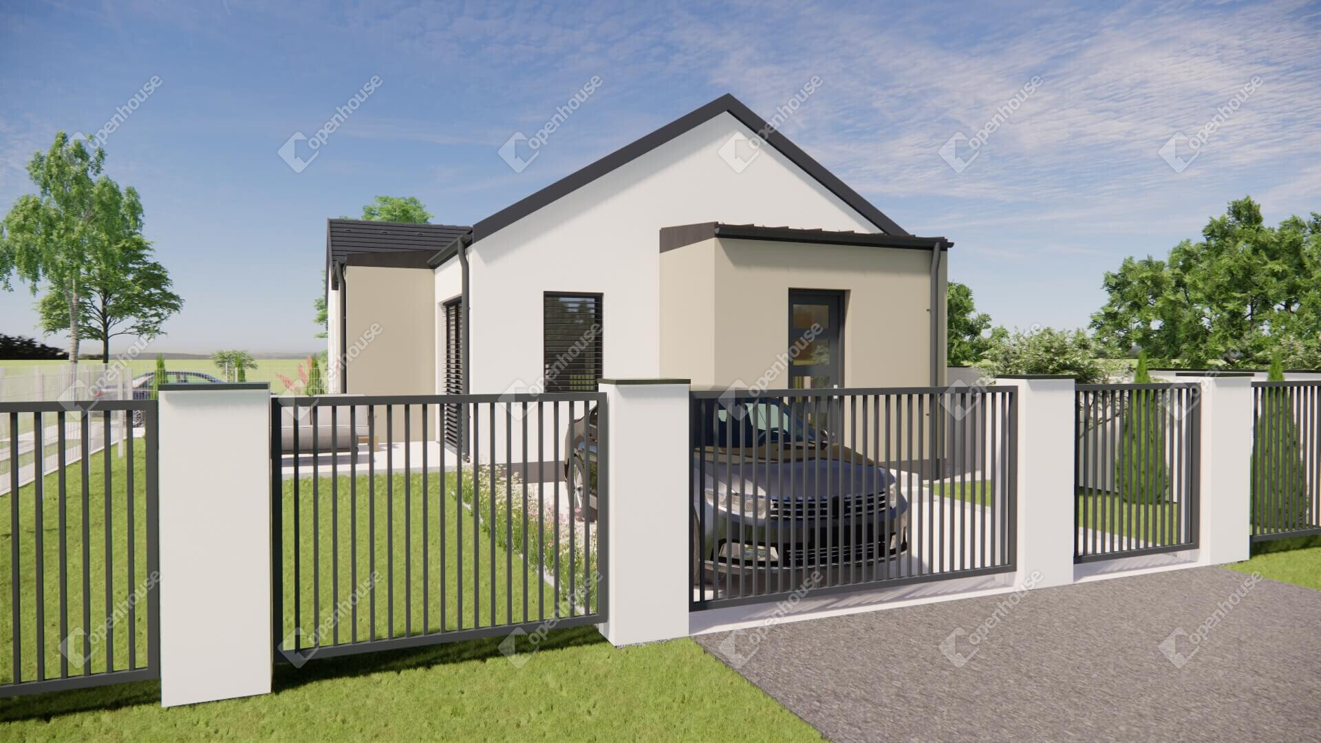 A ház 300 m² telken fekszik.
