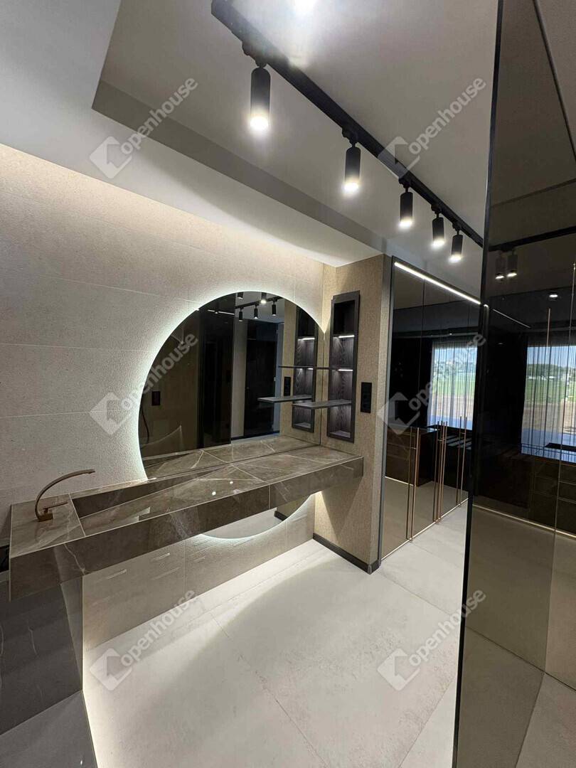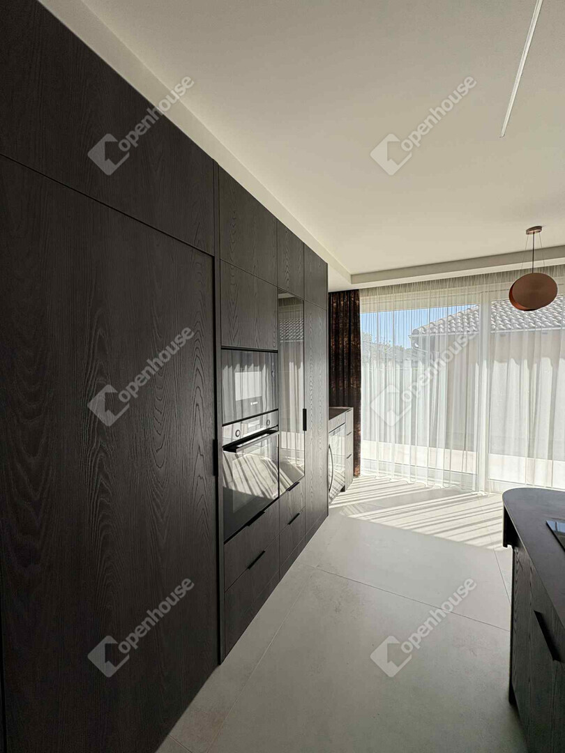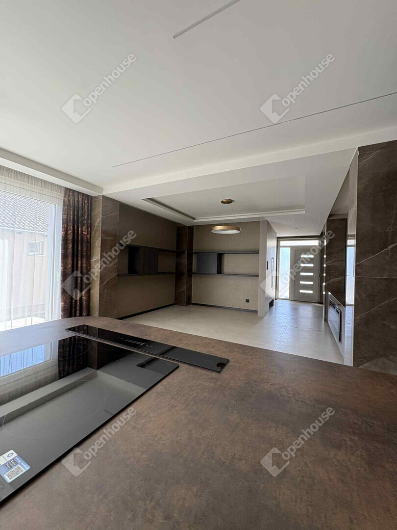 A ház stílusa modern-minimál luxus, amelyet prémium anyaghasználat és egyedi belsőépítészeti megoldások tesznek különlegessé: