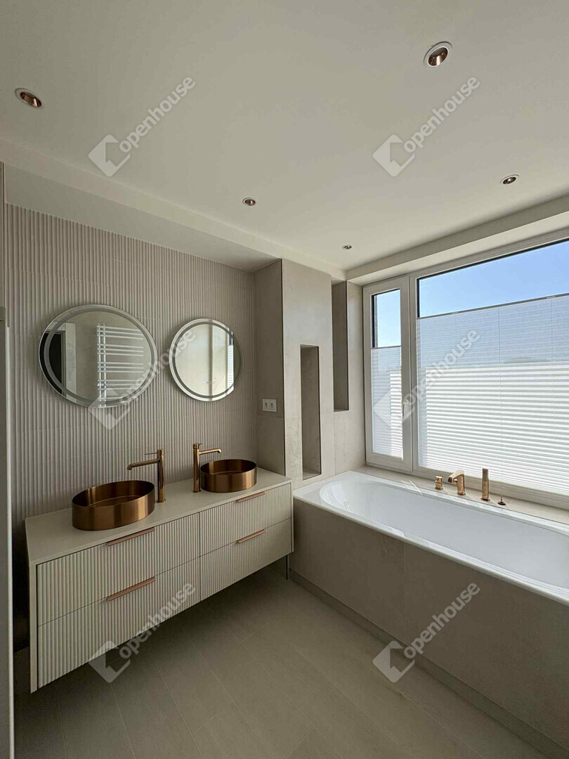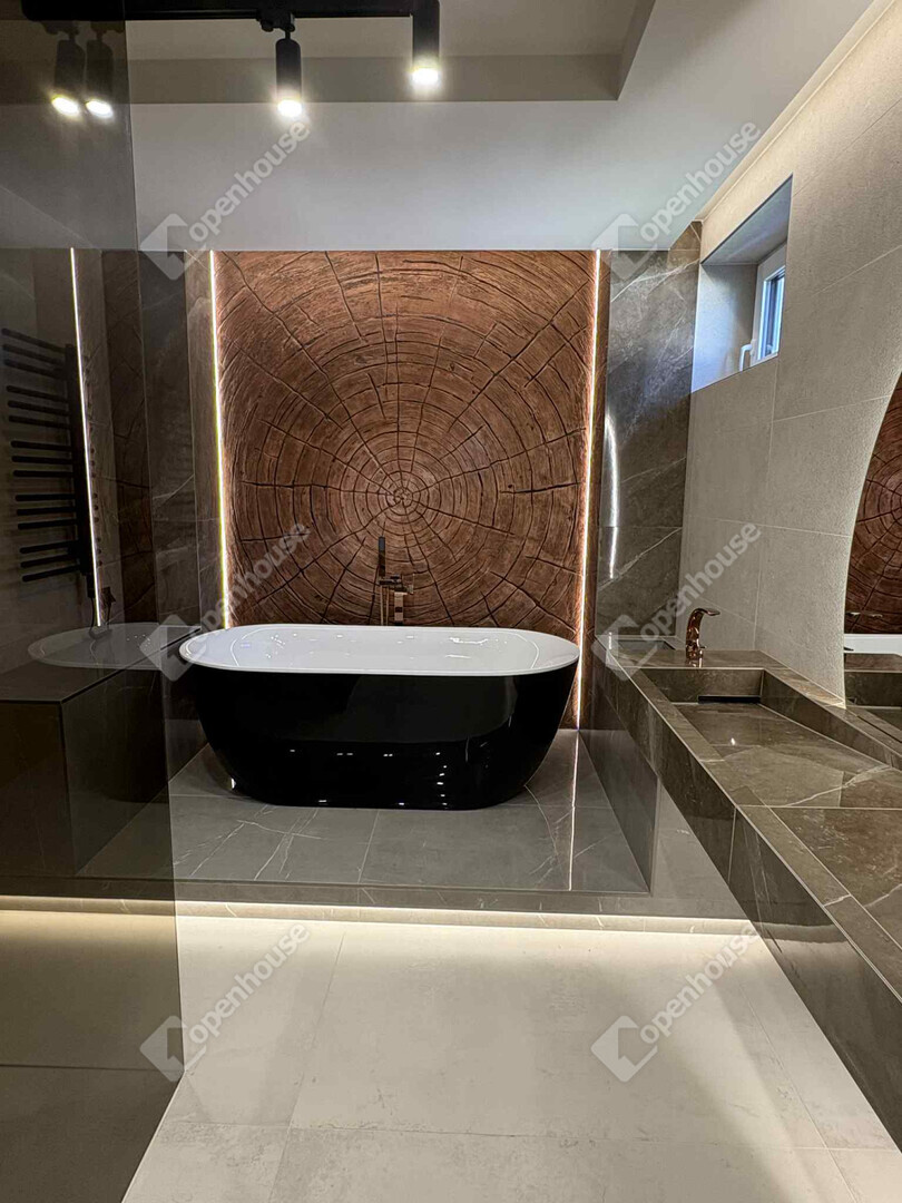 exkluzív fürdőszobák szabadon álló káddal, bronz csaptelepekkel és természetes hatású kőburkolatokkal,
