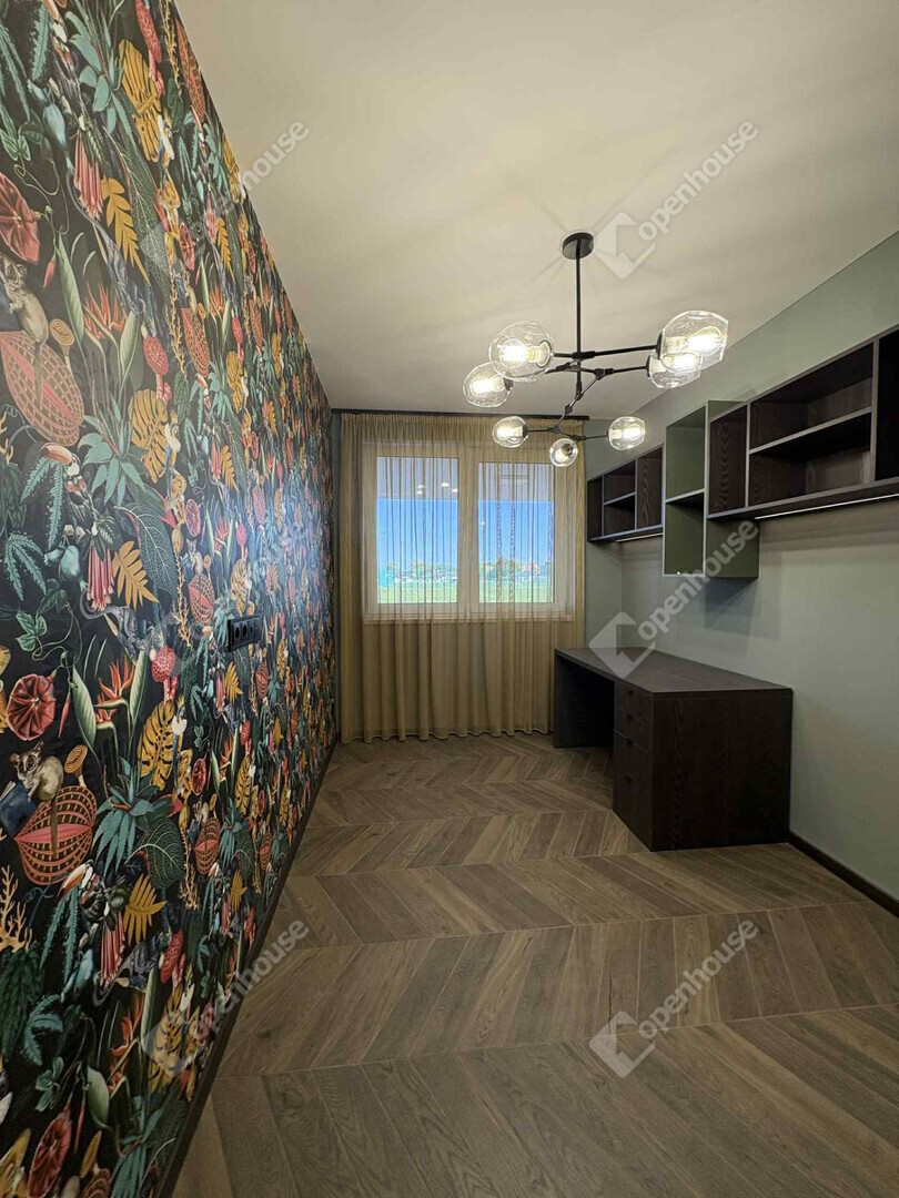 különleges dolgozószoba/gyerekszoba egyedi tapétával és modern lámpatesttel.