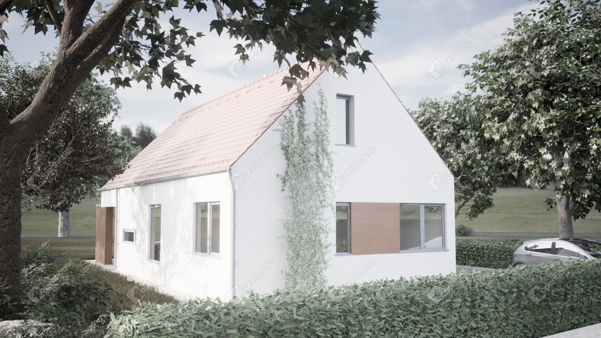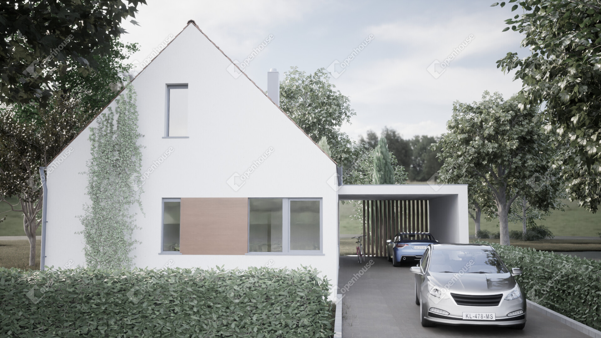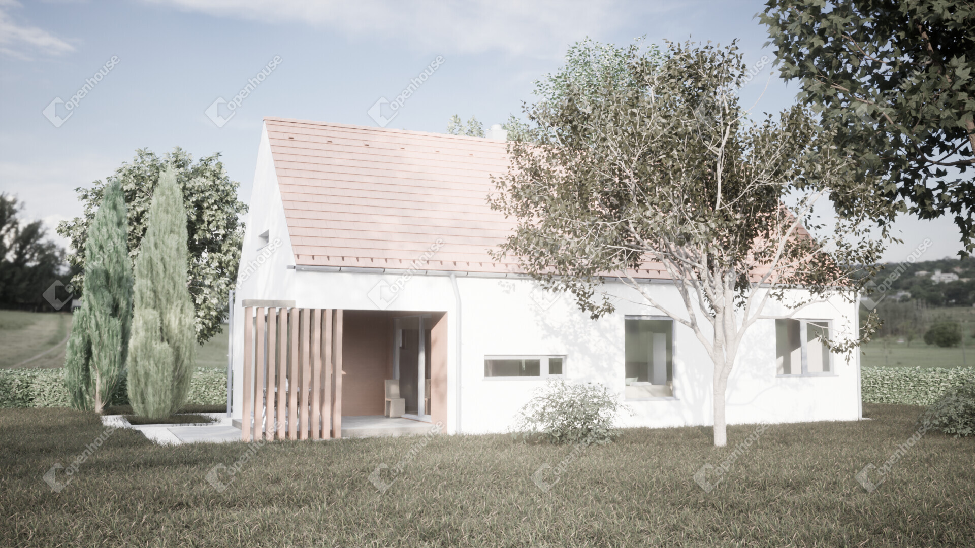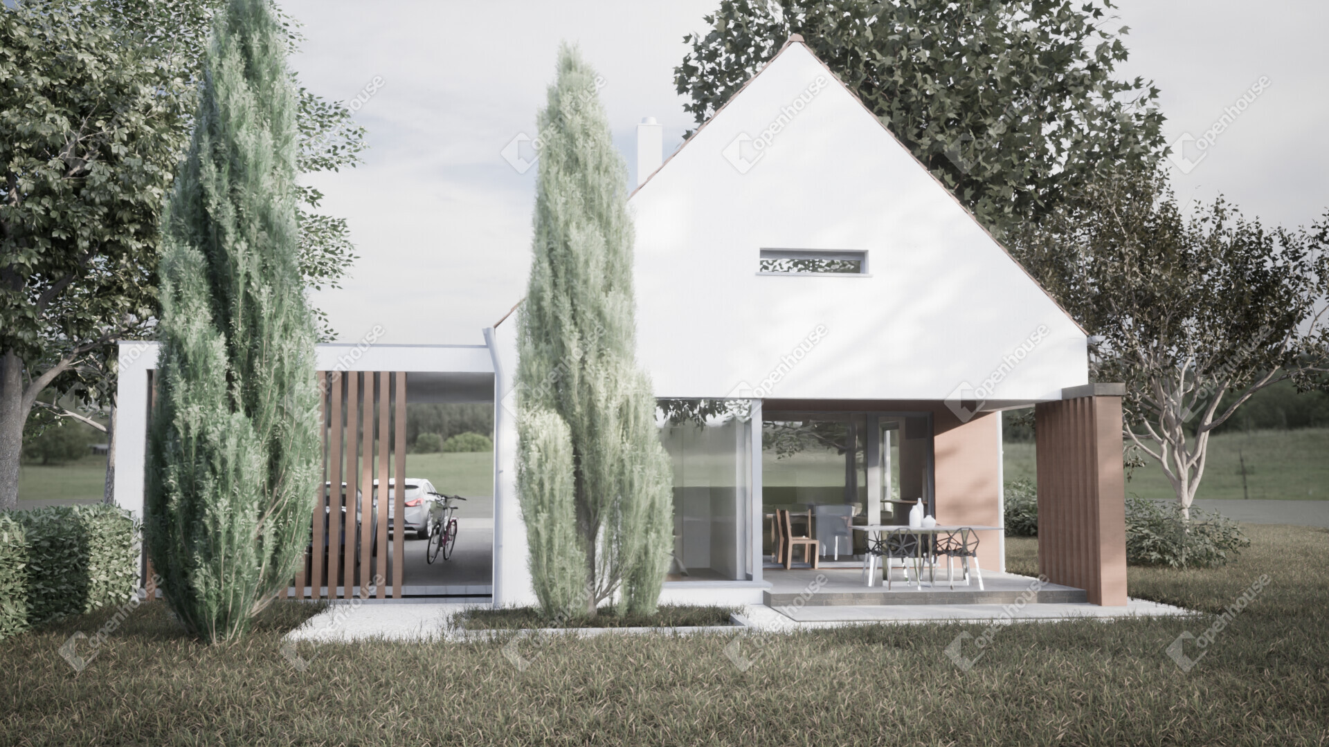 A ház külsejét Terrán Synus tető, Protherm falazat 15 cm hőszigeteléssel, valamint STO nemesvakolat fehér homlokzat teszi időtállóvá és letisztulttá. A teraszról közvetlenül megközelíthető, teherbíró padlástér extra tárolási lehetőséget biztosít.