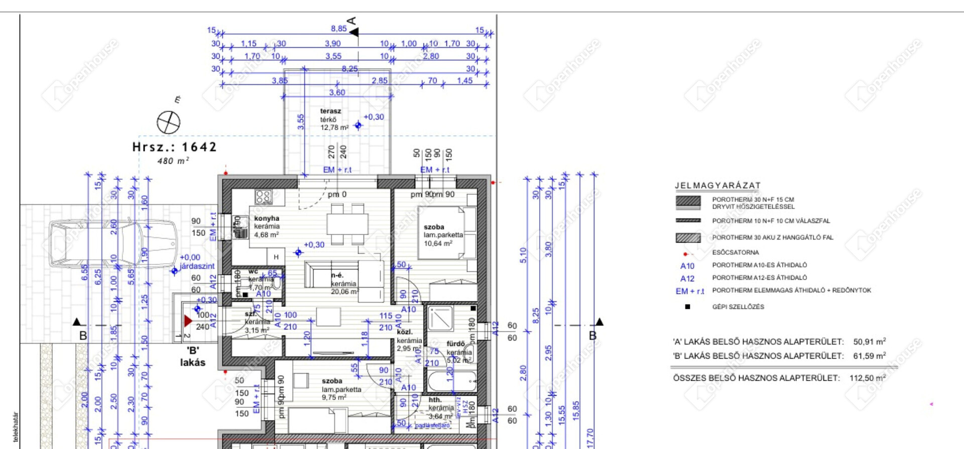 Falazat: A főfalak síkra csiszolt 30 N+F falazóelemből, ragasztóhabbal. Válaszfalak síkra csiszolt 10 -es téglából, ragasztóhabbal.