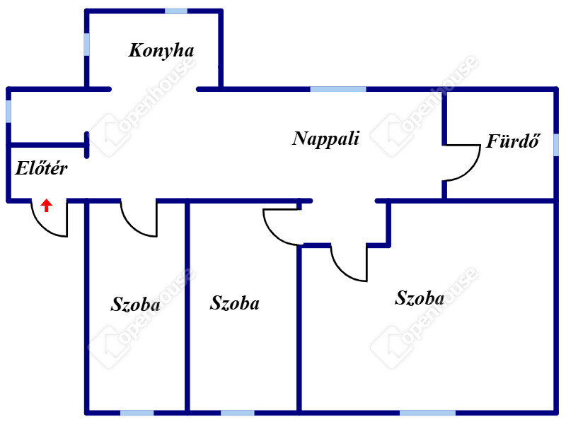 - A házban található egy előszoba, konyha, nappali, fürdőszoba, 3 hálószoba