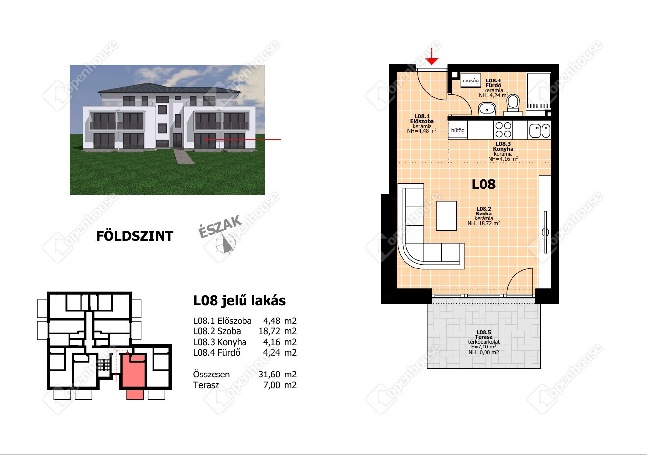 Hegyeshalom új kialakítású részén, új építésű társasházban 32 m² alapterületű, földszinti, kertkapcsolatos, 1 szobás, teraszos lakás eladó!