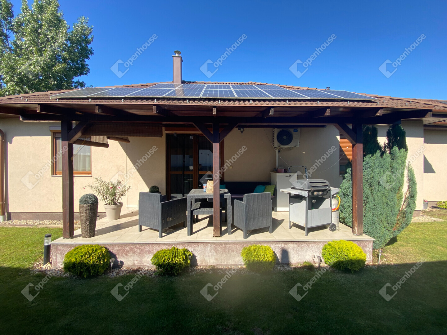 A ház 2023-ban telepített napelemmel rendelkezik, szaldós elszámolással 2033-ig, így rendkívül alacsony rezsiköltséggel üzemeltethető.