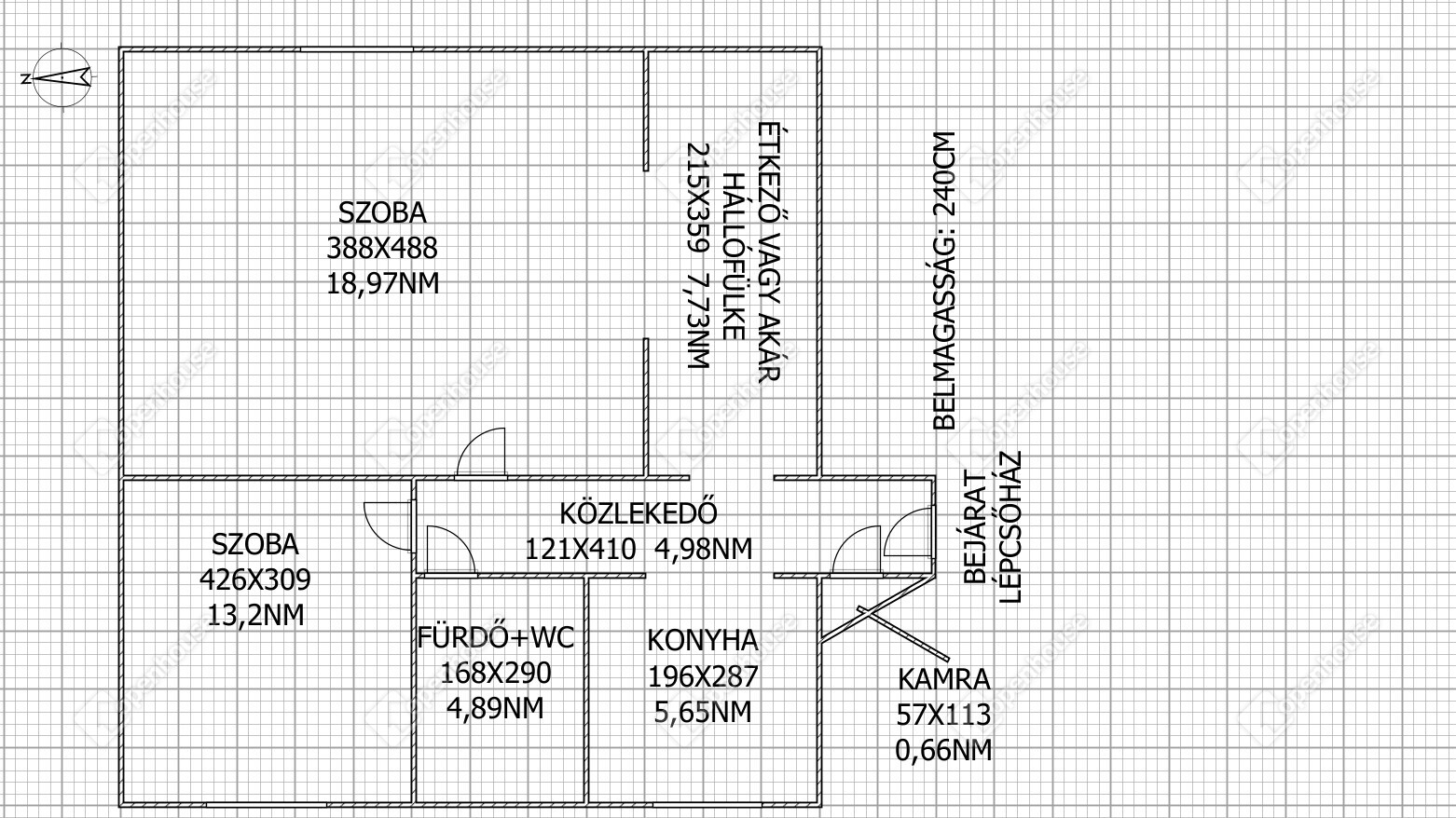 A tetőtéri, 56 m²-es ingatlan jelenlegi elrendezésében 2 szobás, étkezővel, konyhával, közlekedővel, kis kamrával és fürdőszobával (WC-vel együtt) rendelkezik. Az alaprajz jól alakítható, így igény szerint 1+2 félszobás lakás is kialakítható belőle.