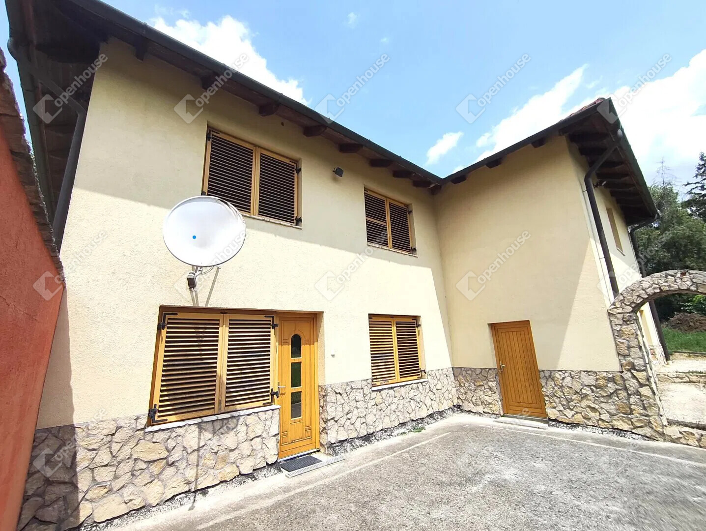 Mediterrán jellegű dizájn: A ház homlokzata meleg, sárgás árnyalatú vakolatot kapott, amely a rusztikus és mediterrán építészeti stílusokra emlékeztet.