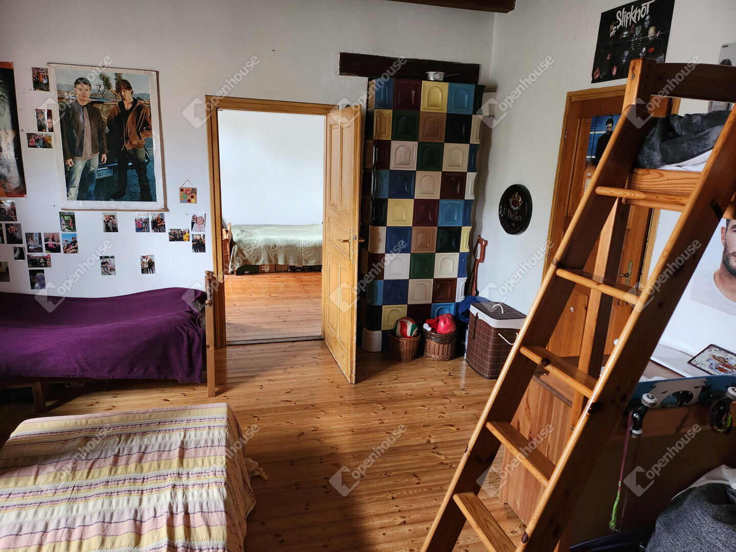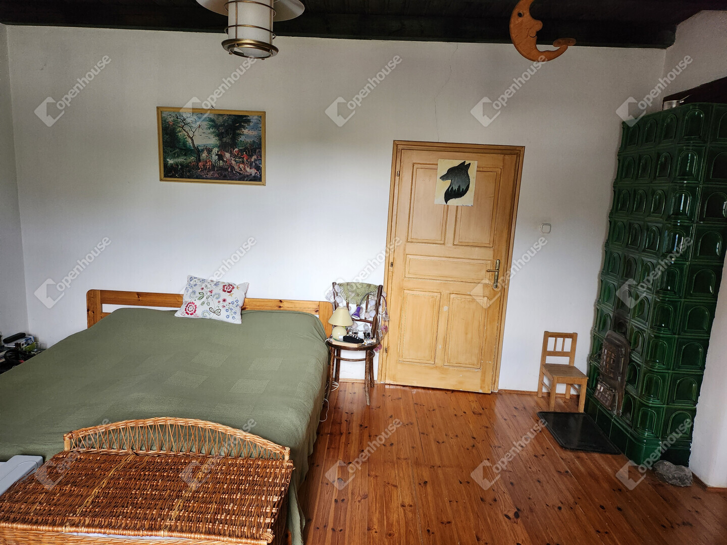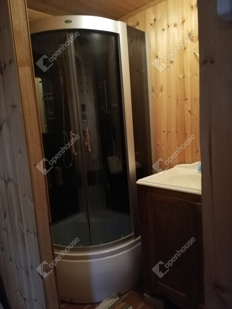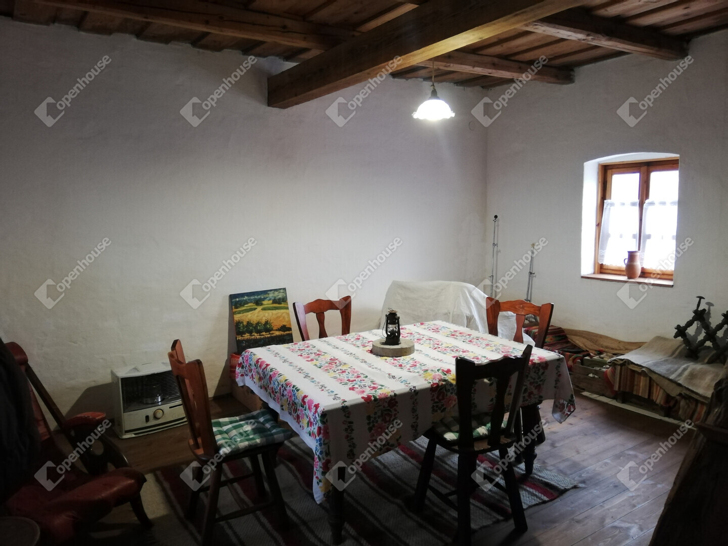 Fűtés: gázkazán radiátorokkal, padlófűtés a fürdőben, valamint egy modern, egyedileg készített cserépkályha a hálószobák között
