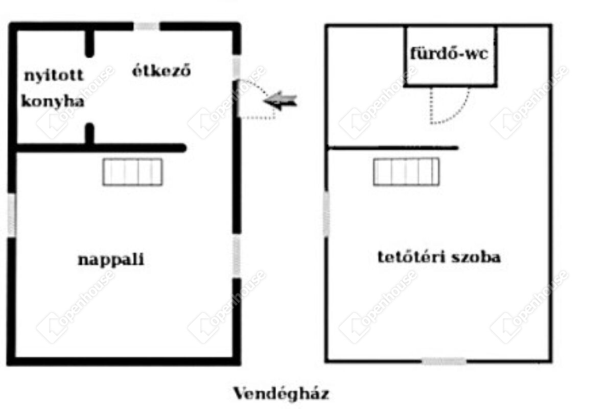 A házban nyitott konyha–étkező, 2 szoba, fürdőszoba és WC kapott helyet.