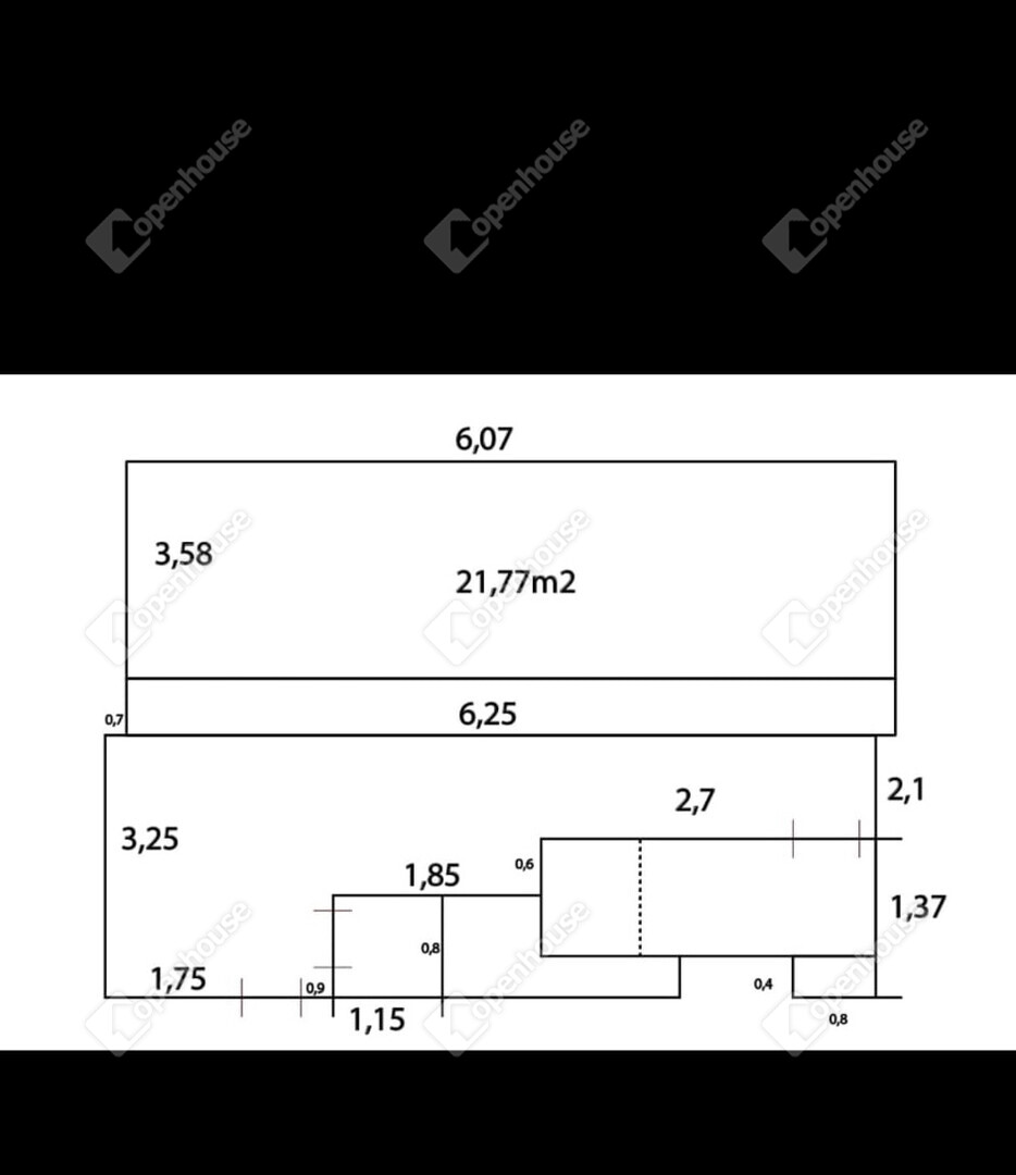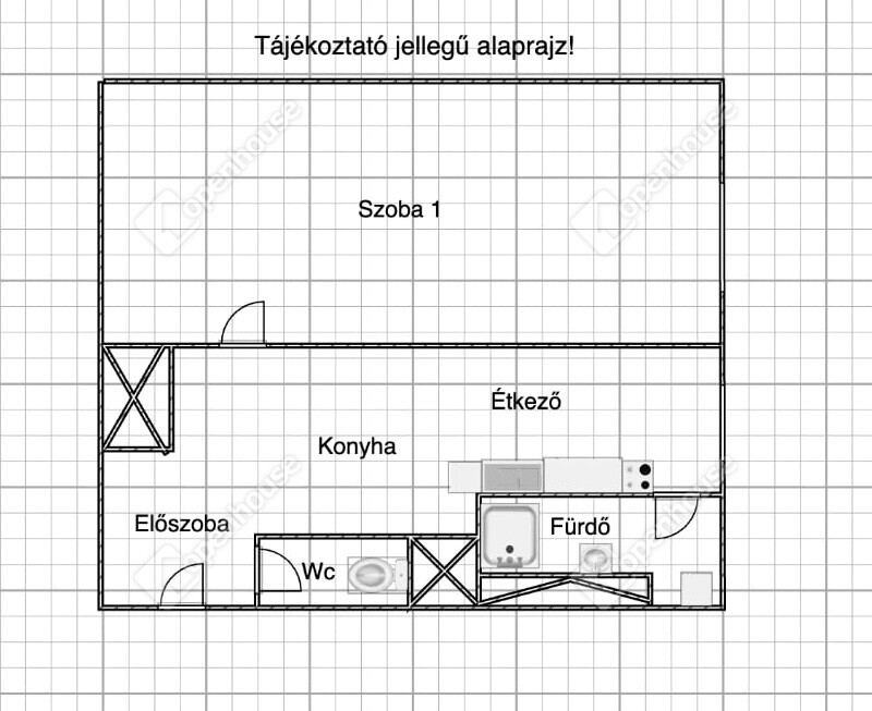 Jelenlegi kialakítás szerint egy nagy szobából, egy tágas konyha-étkezőből, előszobából, fürdőből és külön WC-ből áll.