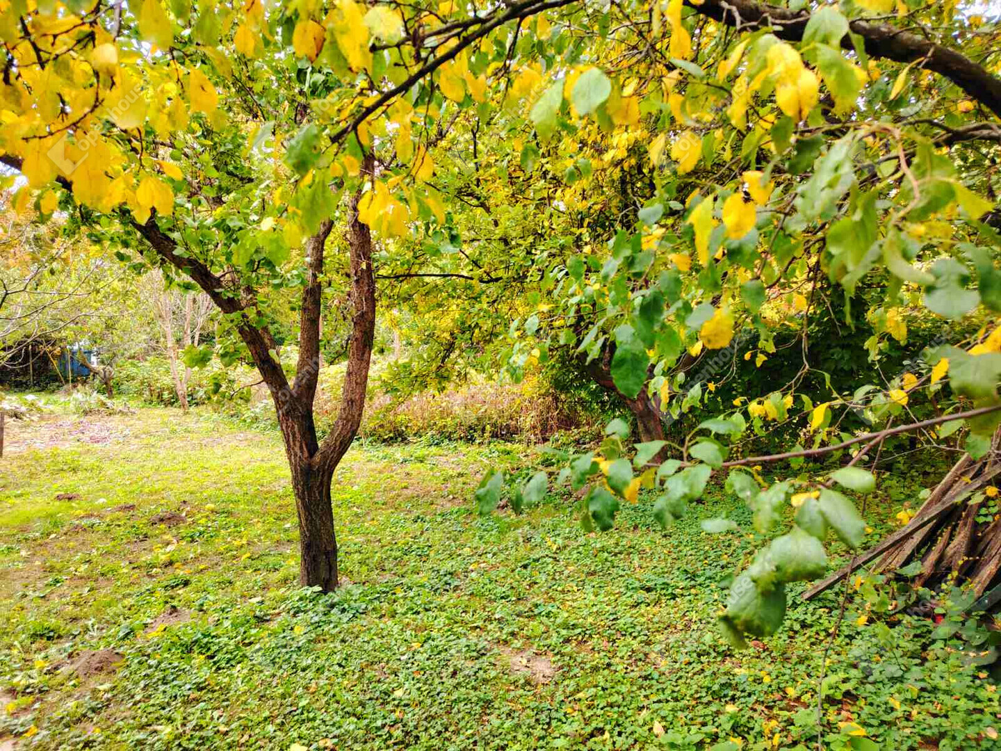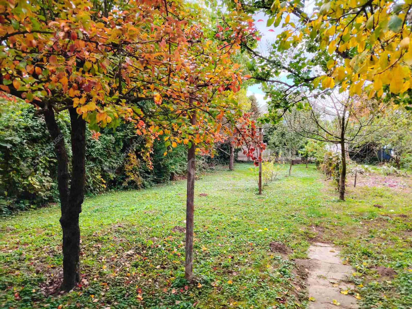A hátsó kertben gyümölcsfák, virágzó bokrok és illatok őrzik az otthon melegét.