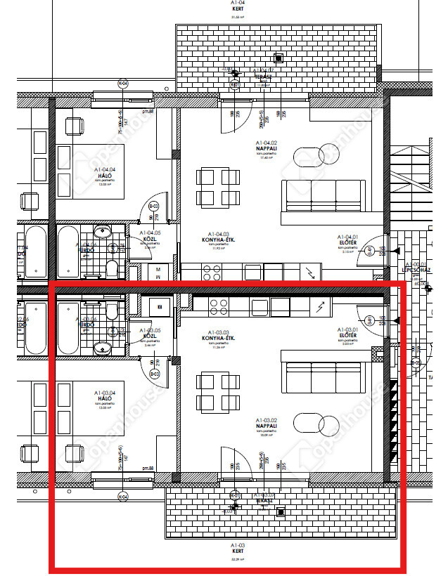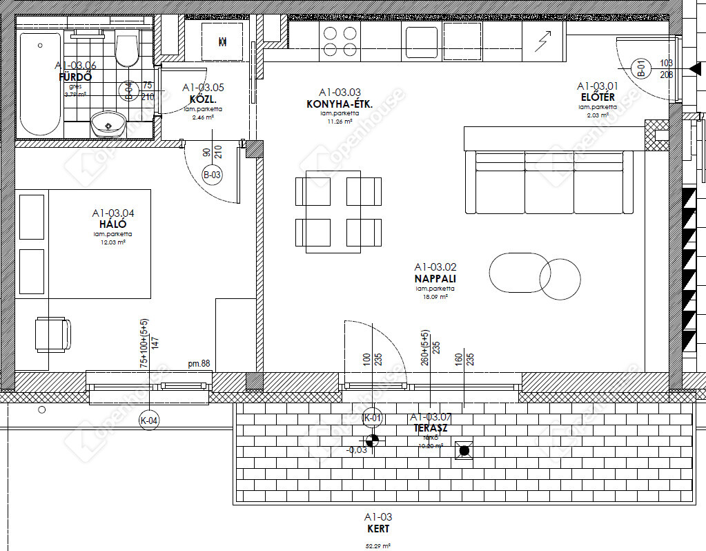 A1-03 jelű lakás 49,66 m2 alapterületű, 10,20 m2 terasszal és 52,29 m2 saját kertkapcsolattal rendelkezik.