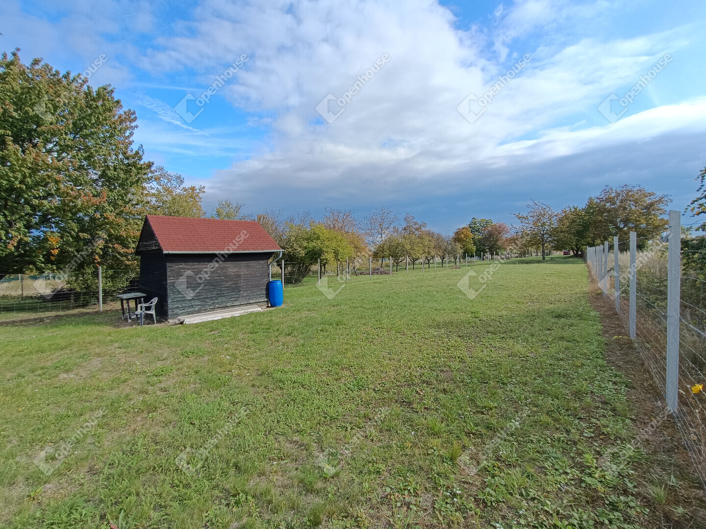 A telek körbekerített, karbantartott, pár gyümölcsfa és egy szerszámtartó áll rajta.