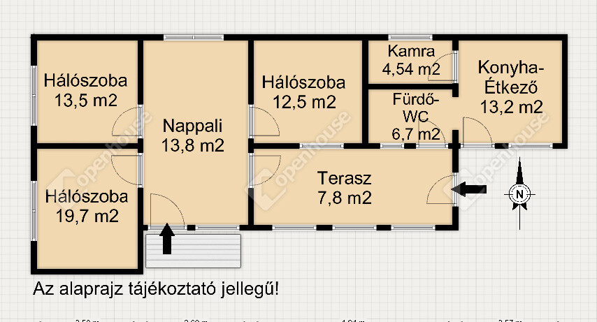 - helyiségek: 3 tágas hálószoba, nappali, fedett veranda, konyha-étkező, kamra, fürdő, külön WC