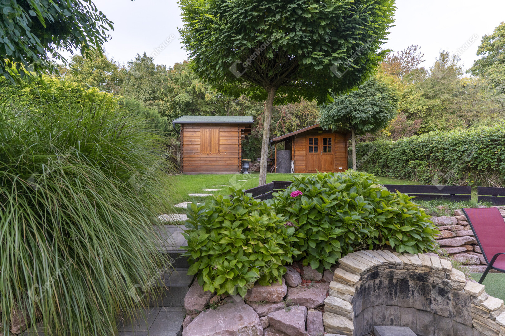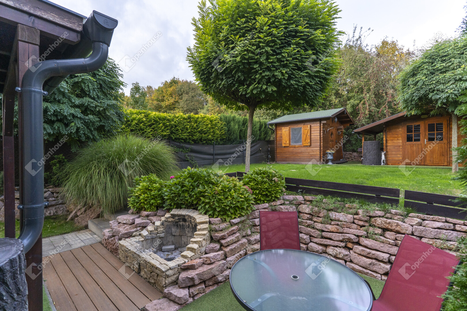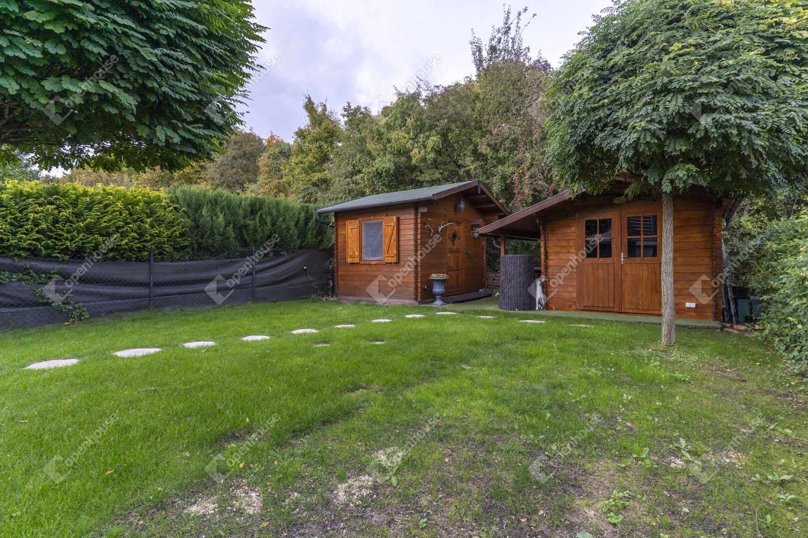 A kertben található két faház (egy 3×3 m-es tároló és egy Hőszigetelt 4×3 m-es, villannyal és vízzel ellátott prémium kivitelű) funkcionális és esztétikai értéket is ad, tökéletesen illeszkedve a természetes környezethez.