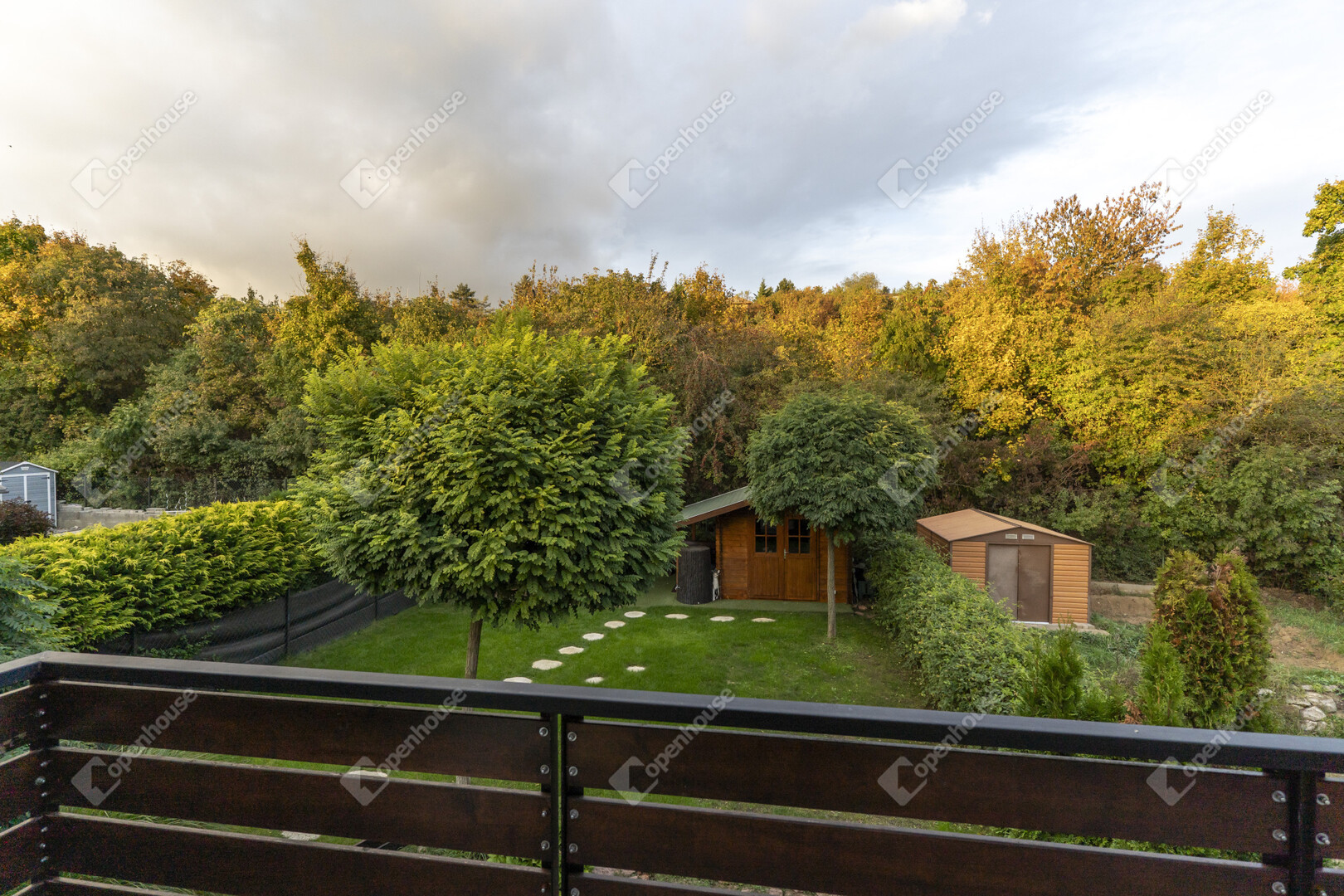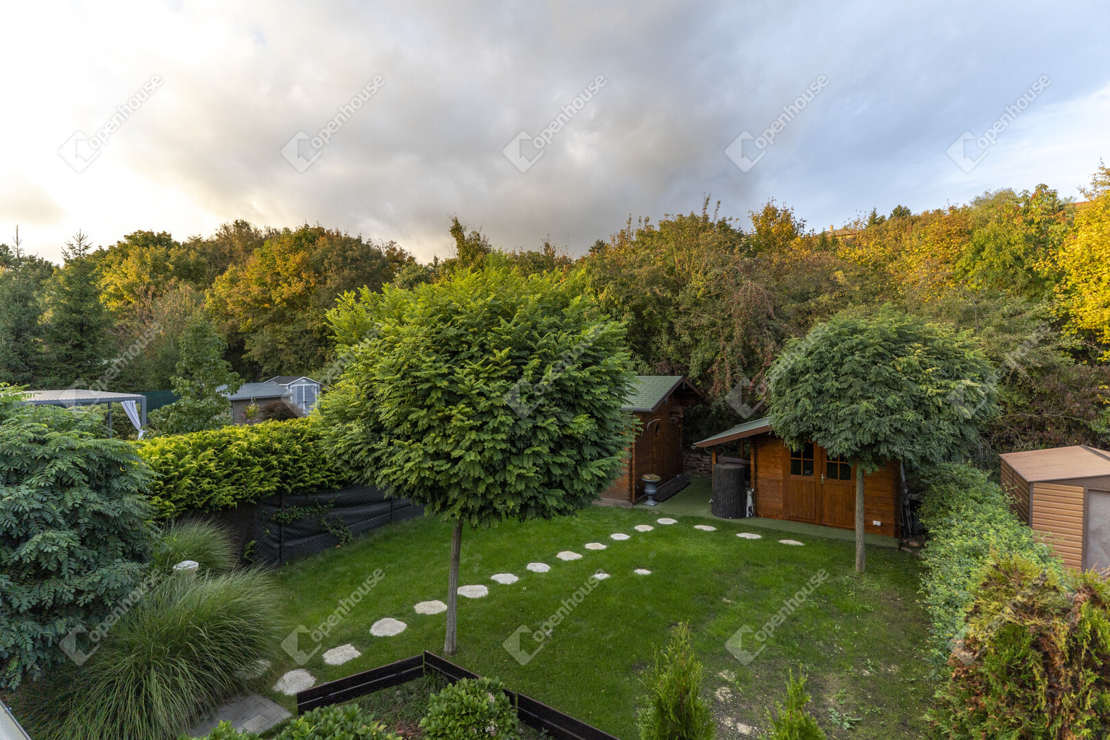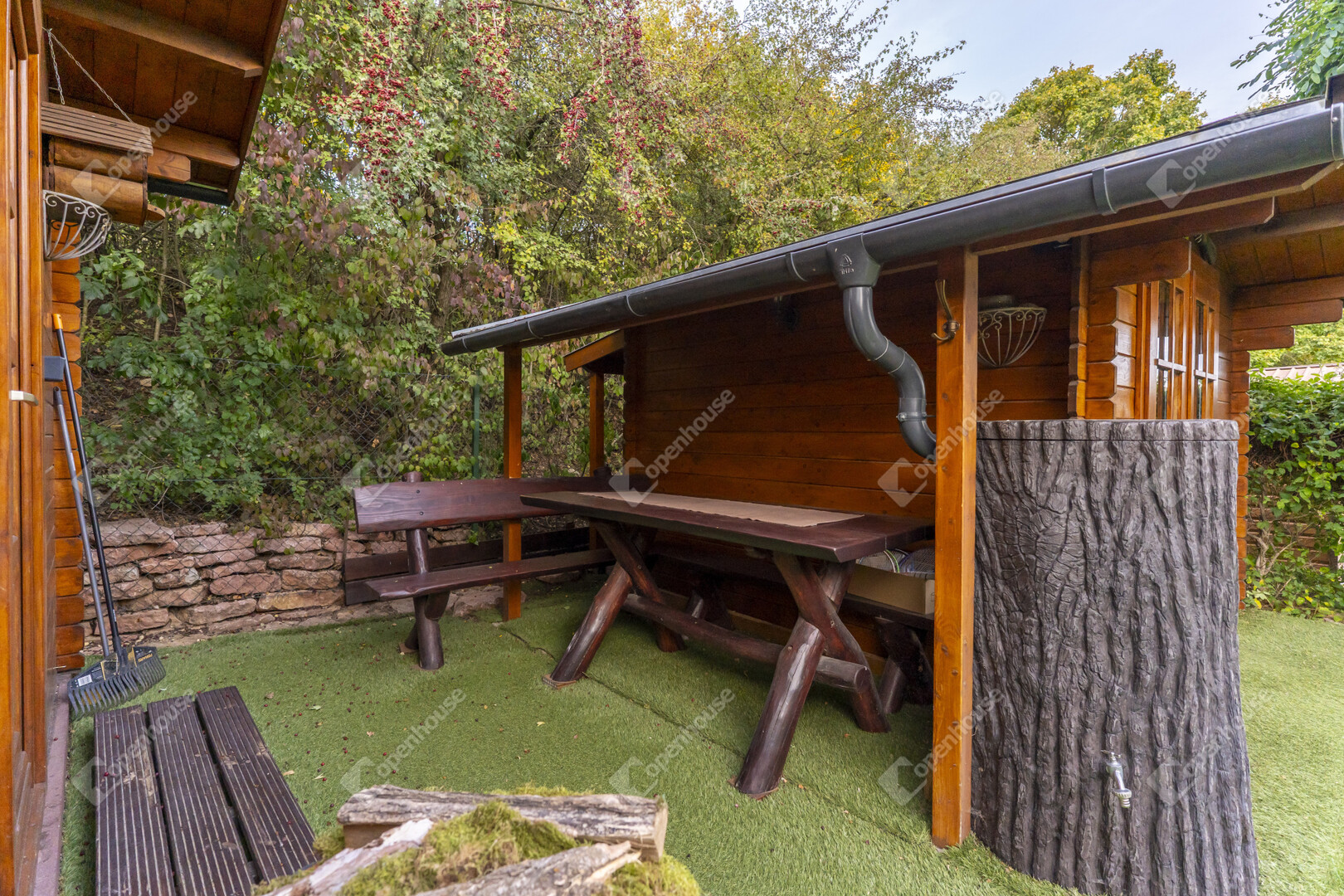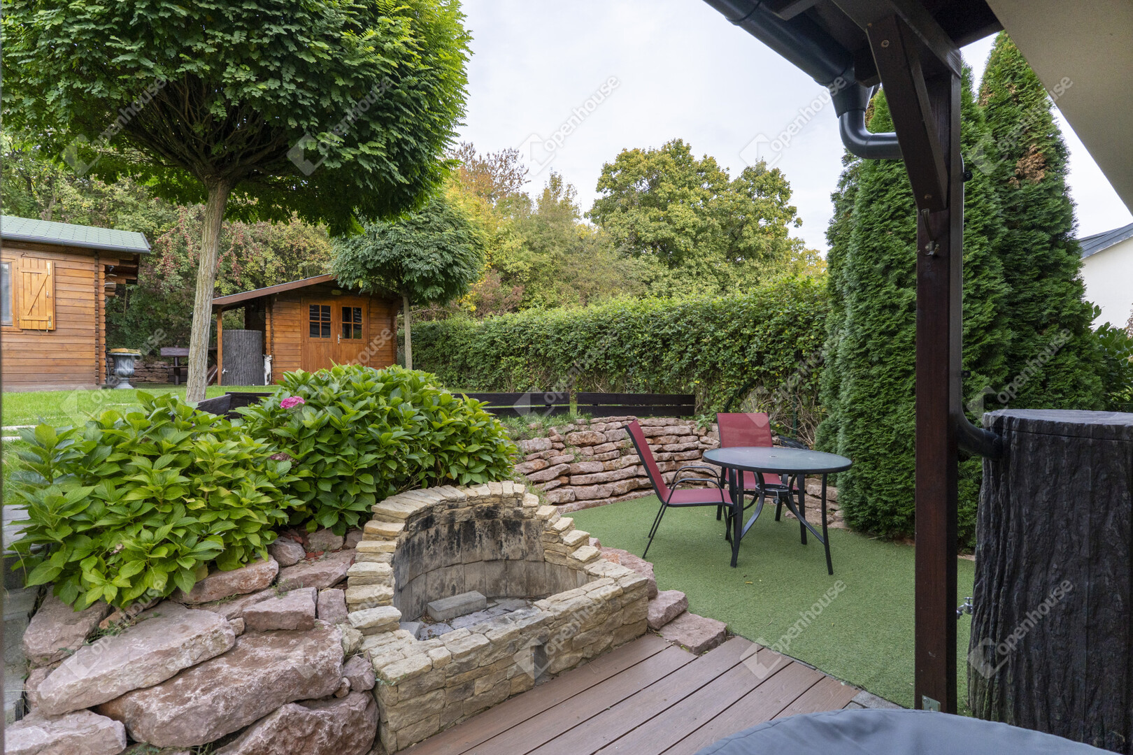 A kertben található két faház (egy 3×3 m-es tároló és egy Hőszigetelt 4×3 m-es, villannyal és vízzel ellátott prémium kivitelű) funkcionális és esztétikai értéket is ad, tökéletesen illeszkedve a természetes környezethez.