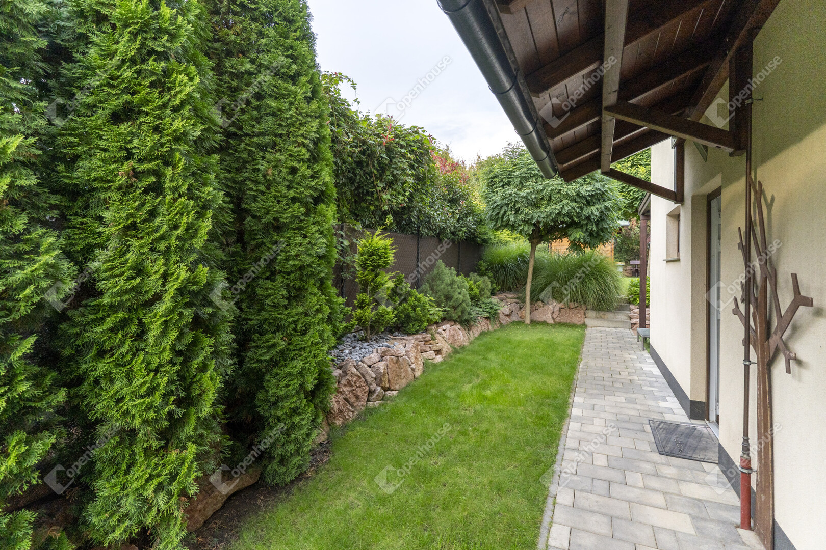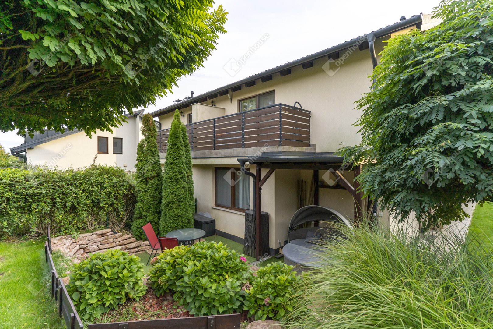 A ház egyik legnagyobb ékessége a gondosan megtervezett és karbantartott kert, amely a tulajdonos igényes munkáját tükrözi.