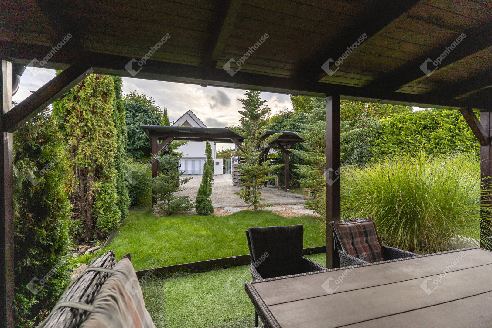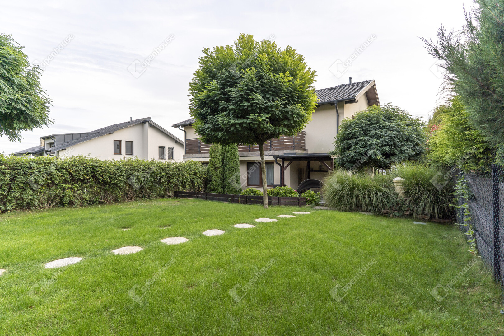 A zöld pázsit, dísznövények és tujasorok harmonikus elrendezésben ölelik körül a házat, minden évszakban rendezett, esztétikus látványt nyújtva.