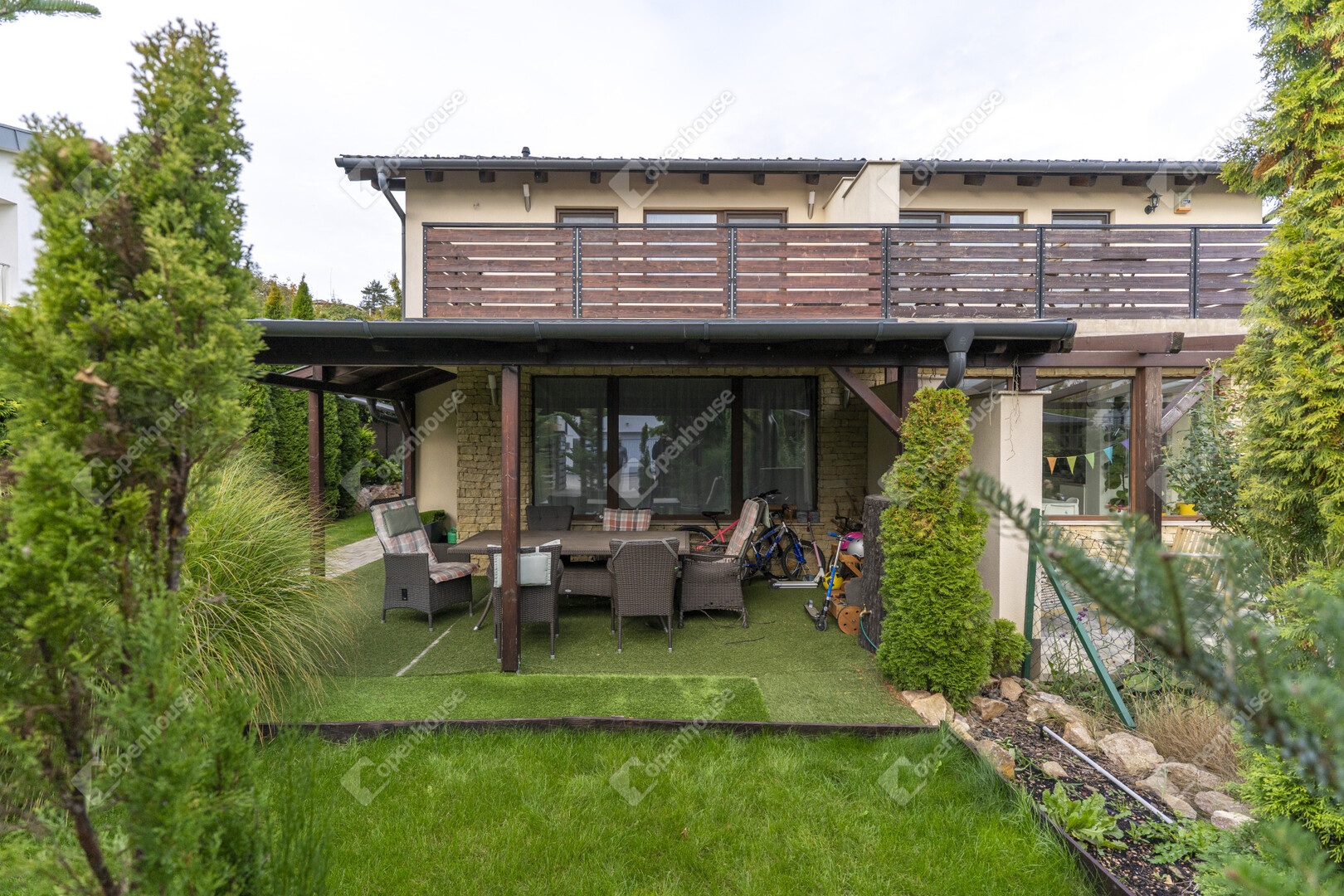 Ez a nagykovácsi ikerház nem csupán modern építészeti megoldásaival, hanem a gondosan kialakított, élettel teli kertjével is kiemelkedik a kínálatból.