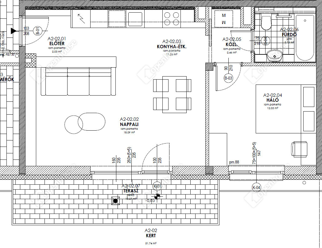A2-02 jelű lakás 49,66 m2 alapterületű, 10,27 m2 terasszal és 51,74 m2 saját kertkapcsolattal rendelkezik.