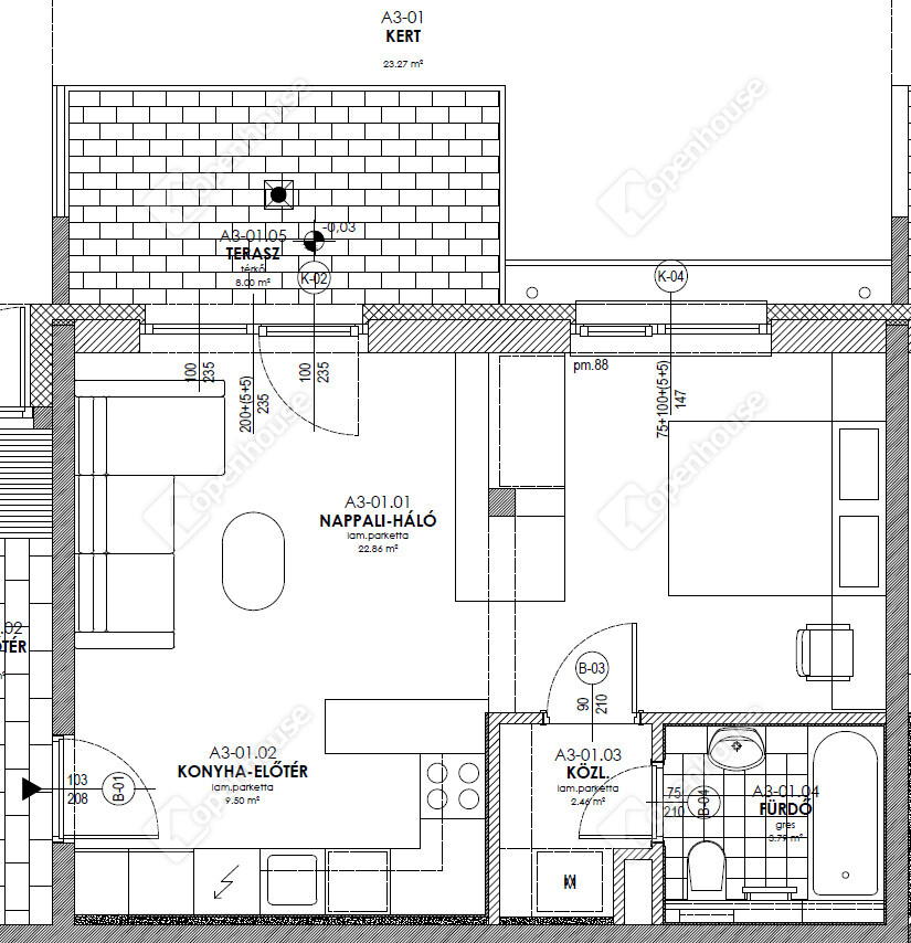 A3-01 jelű lakás 38,79 m2 alapterületű, 8 m2 terasszal és 23,27 m2 saját kertkapcsolattal rendelkezik.