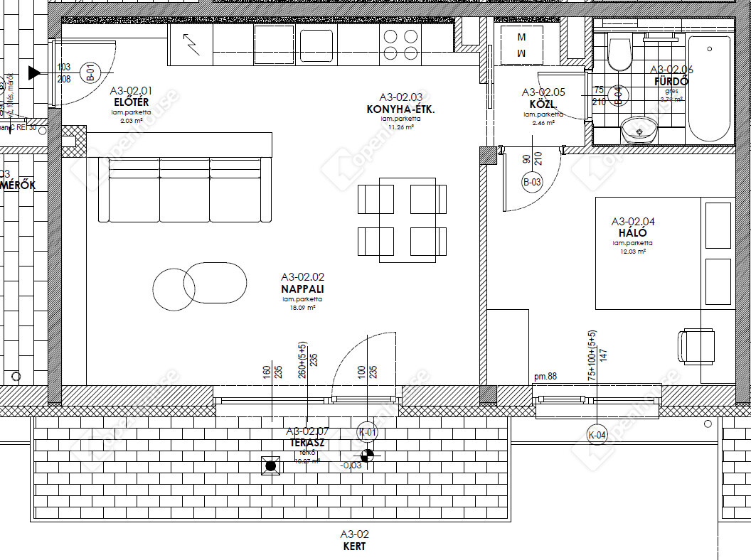 A3-02 jelű lakás 49,66 m2 alapterületű, 10,27 m2 terasszal és 49,81 m2 saját kertkapcsolattal rendelkezik.