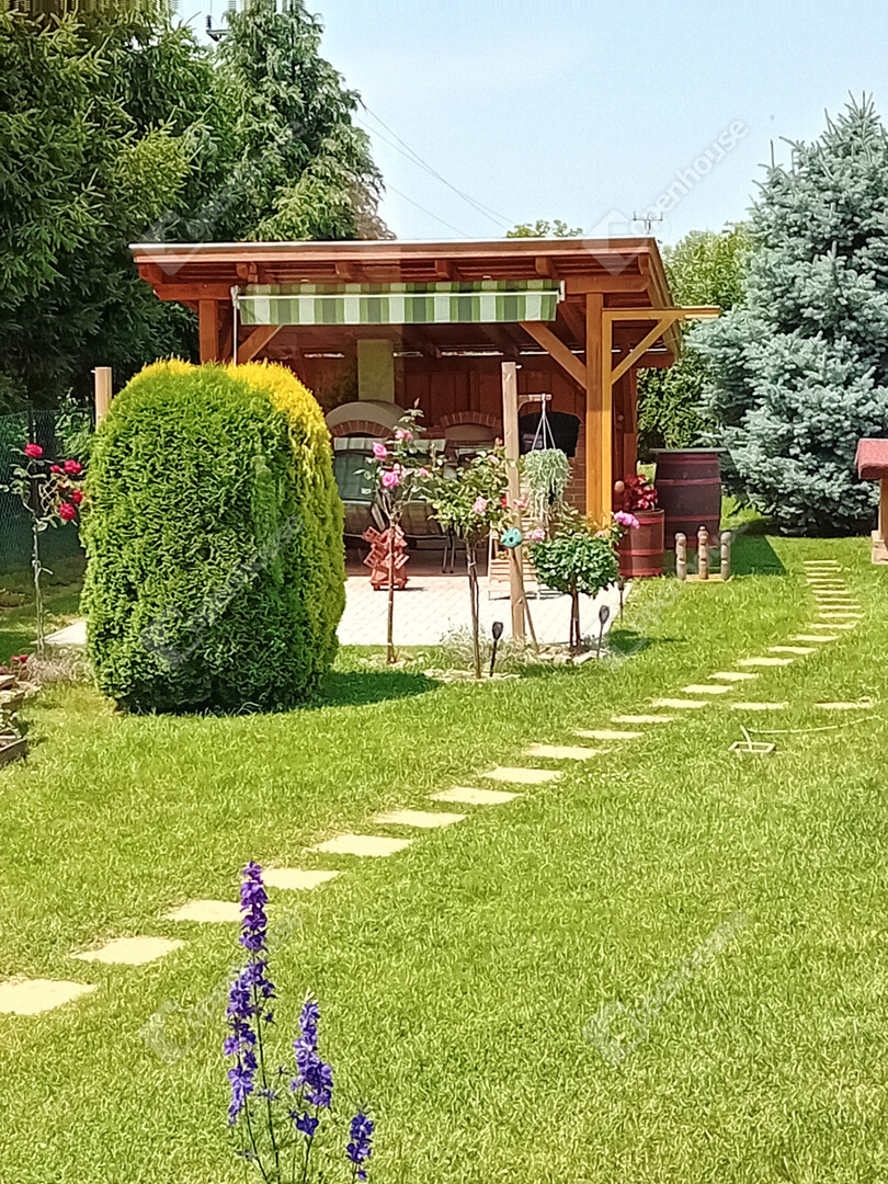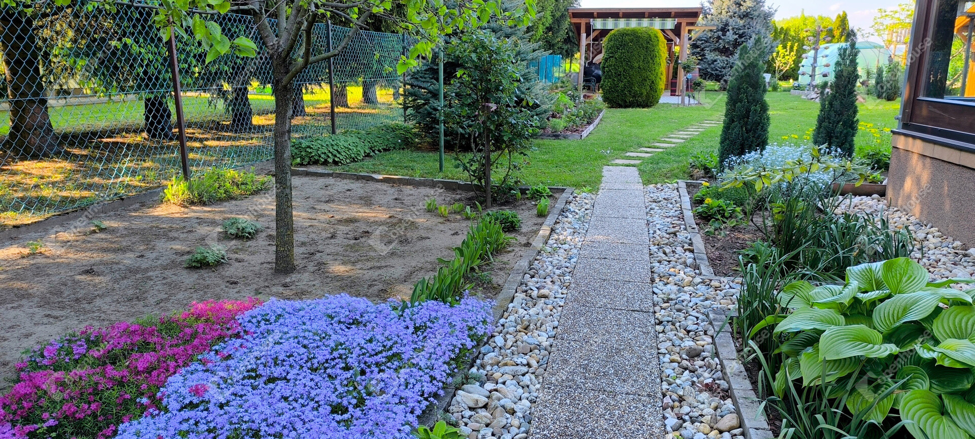 A gondozott, parkosított , dísznövényekkel, számtalan virággal, termő gyümölcsfával betelepített kert 1150 nm.