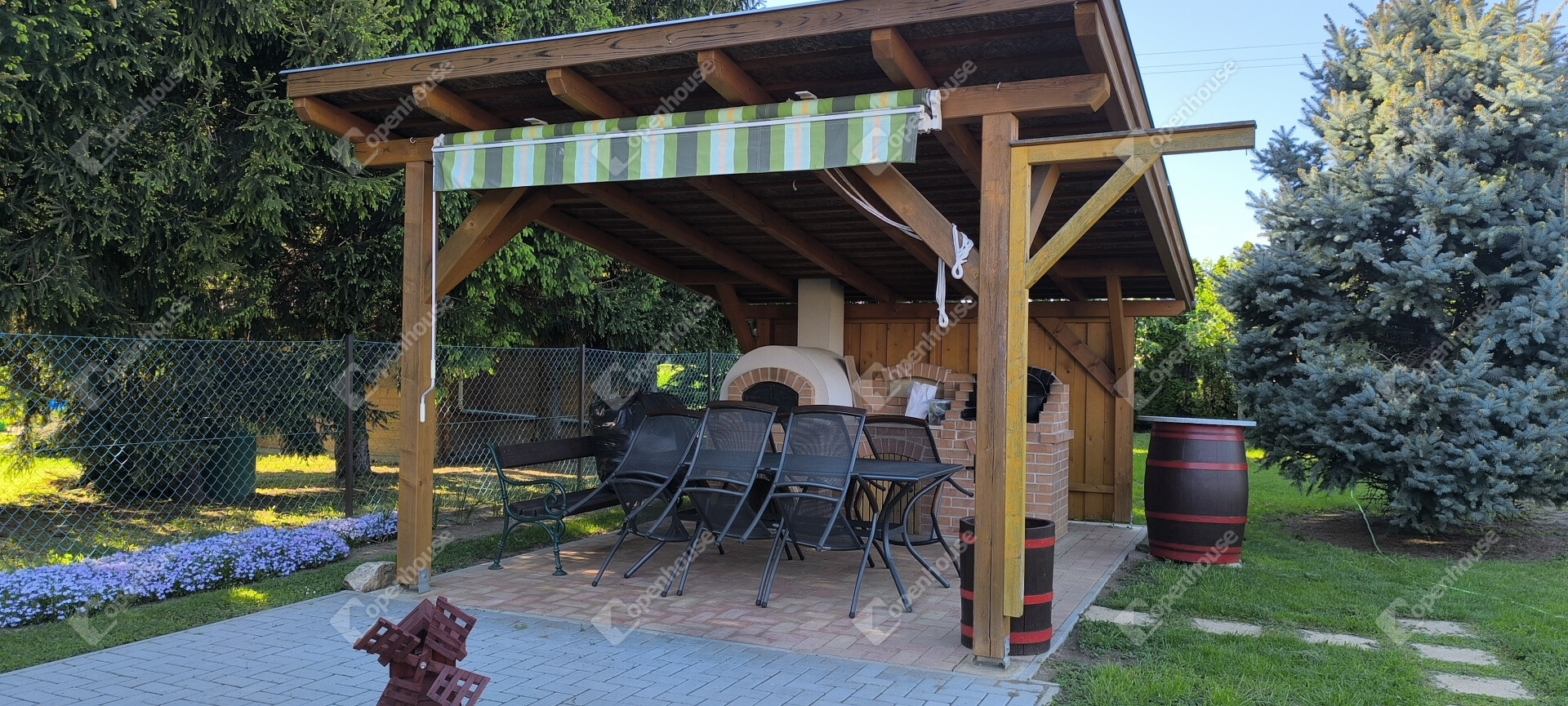 A kertben nyári konyha kapott helyet , nem csak a sütés-főzés praktikus helyszíne nyaranta, de hangulatos látványeleme is a kertnek, ahol szívesen gyűlik össze a család és a vendégek.