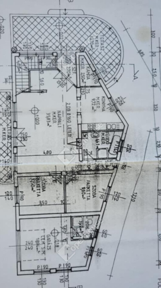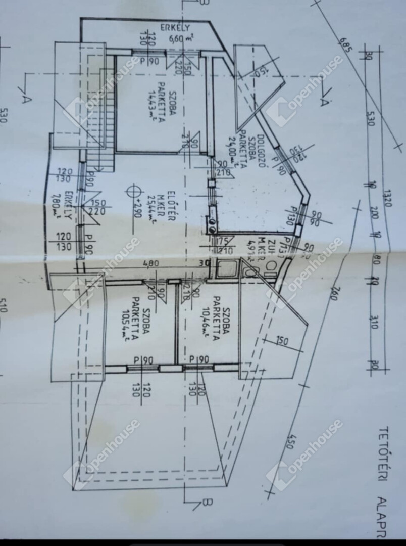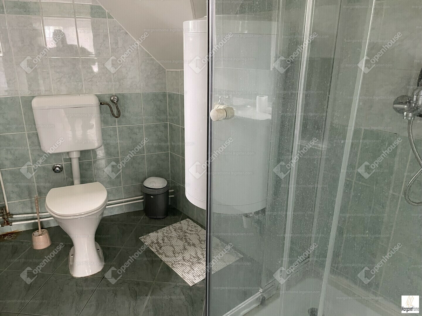 Felső szinten nappali nagy erkéllyel, 3 hálószoba, konyha-étkező, kamra, fürdő, wc.