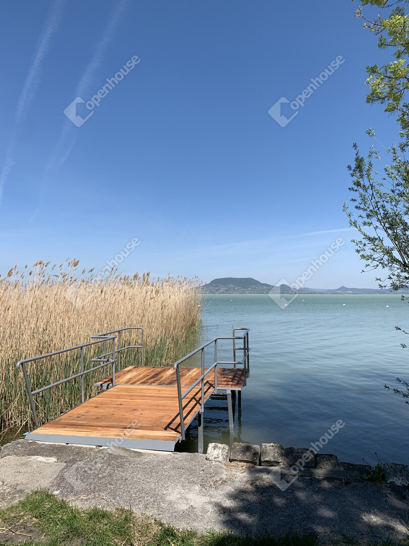 Az épület közvetlenül a Balaton parton helyezkedik el, saját lejáróval és stéggel.
