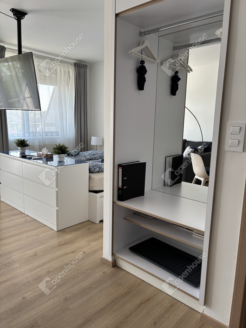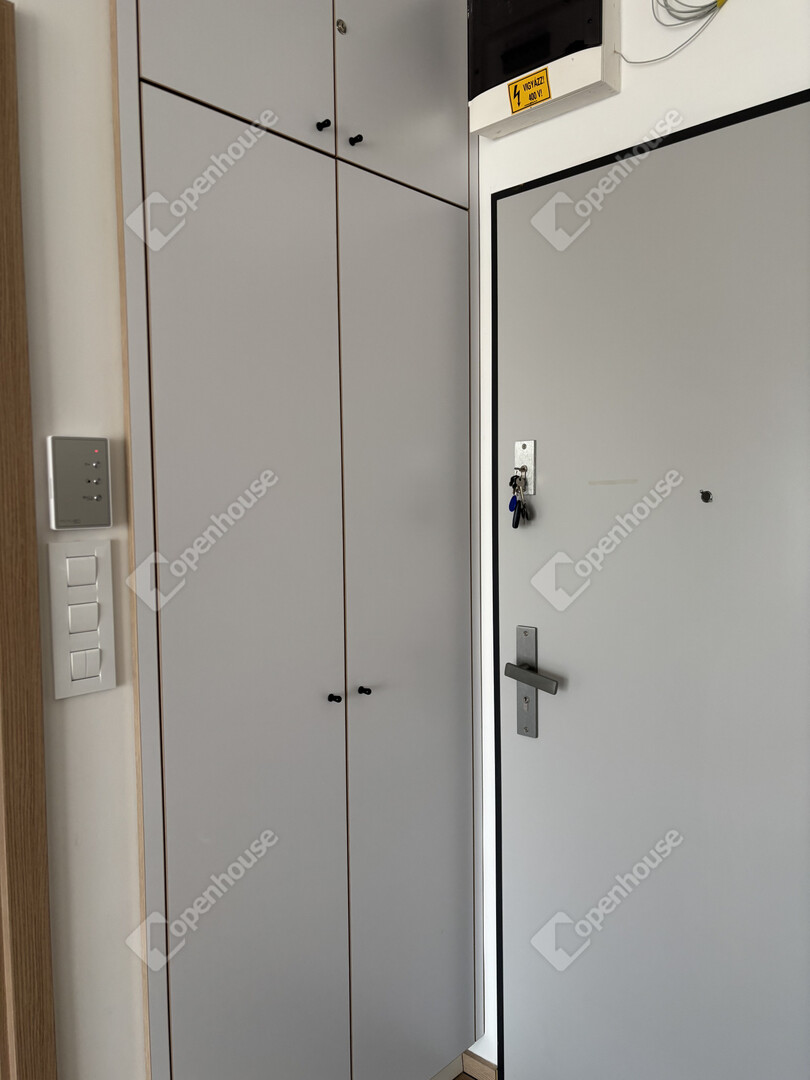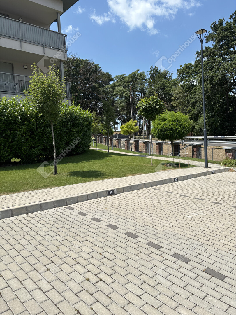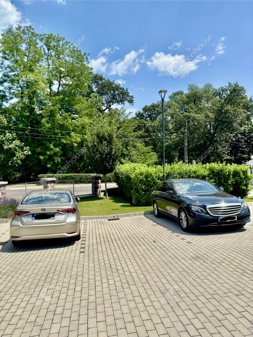 A lakáshoz tartozik egy saját, kizárólagos használatú parkolóhely a társasház elektromos működtetésű kapuval védett udvarán.