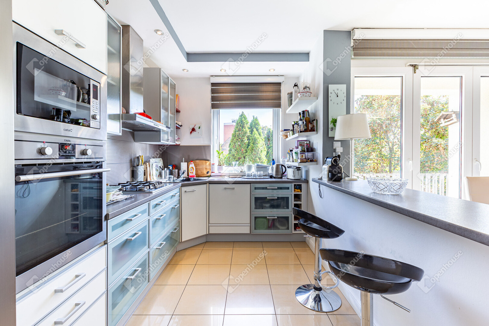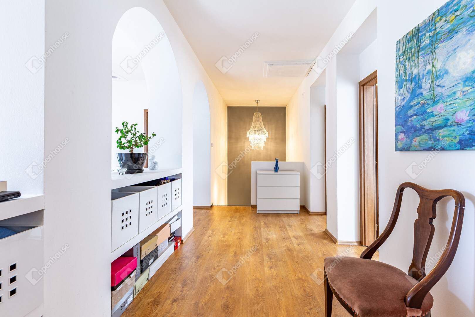 A nappaliban kandalló és a bár-sarok mellett a nyitott légtérben csodálatos boltíves térelválasztási megoldással találkozhatunk. A lakás fűtése gáz-cirko, padló és radiátoros hőleadókkal megoldott. Az összes külső nyílászáró korszerű hő-és hangszigetelt műanyag. A belső nyílászárók a fürdőszobán és a hálószobákon találhatók. A konyhában egyedi tervezésű bútort találunk korszerű gépekkel. Meglepő lehet de kamra is rendelkezésre áll, kiváló pakolási lehetőséget biztosítva. Az étkezőből és a mellette lévő szobából is nyílik kijárat a nagyméretű erkélyre, ahonnan a belső zöld kertre nyílik kilátás. Ennek a kertnek a végében még egy 20 nm-es tároló kiváló lehetőség a kerti bútorok és pl. grillező tárolására.