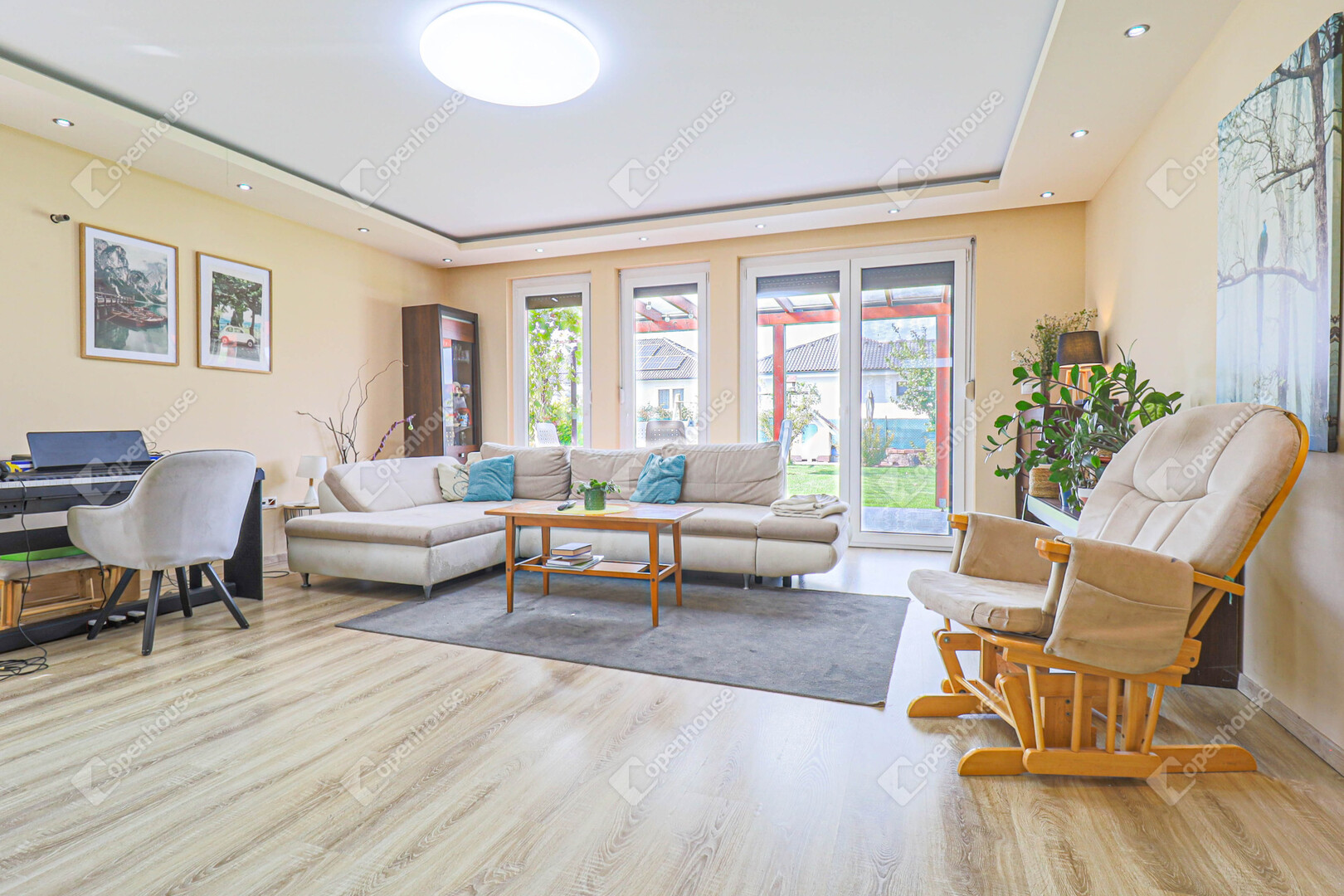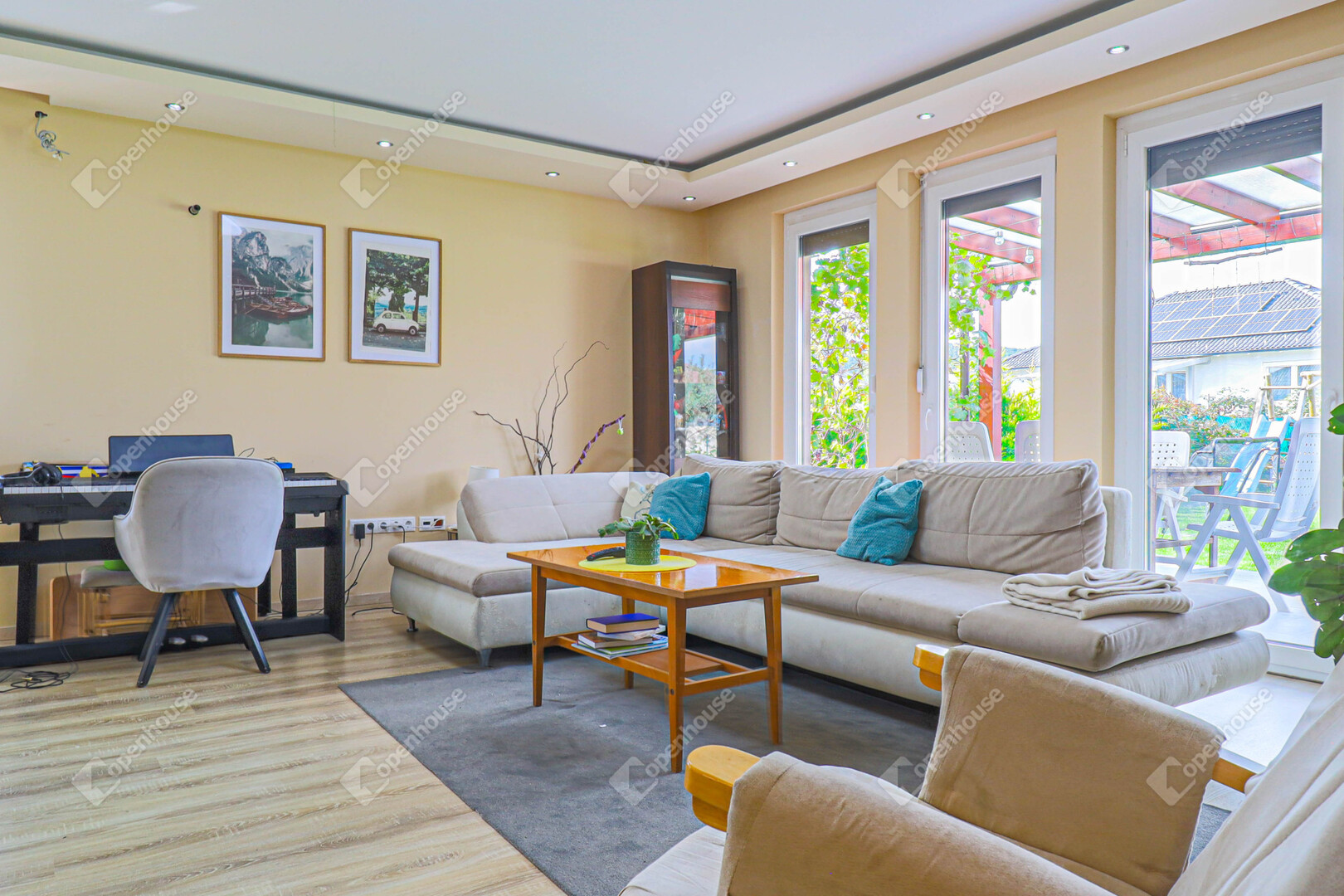 tágas, amerikai konyhás nappali, közvetlen kijárattal a 15 m²-es fedett teraszra, klíma előkészítéssel