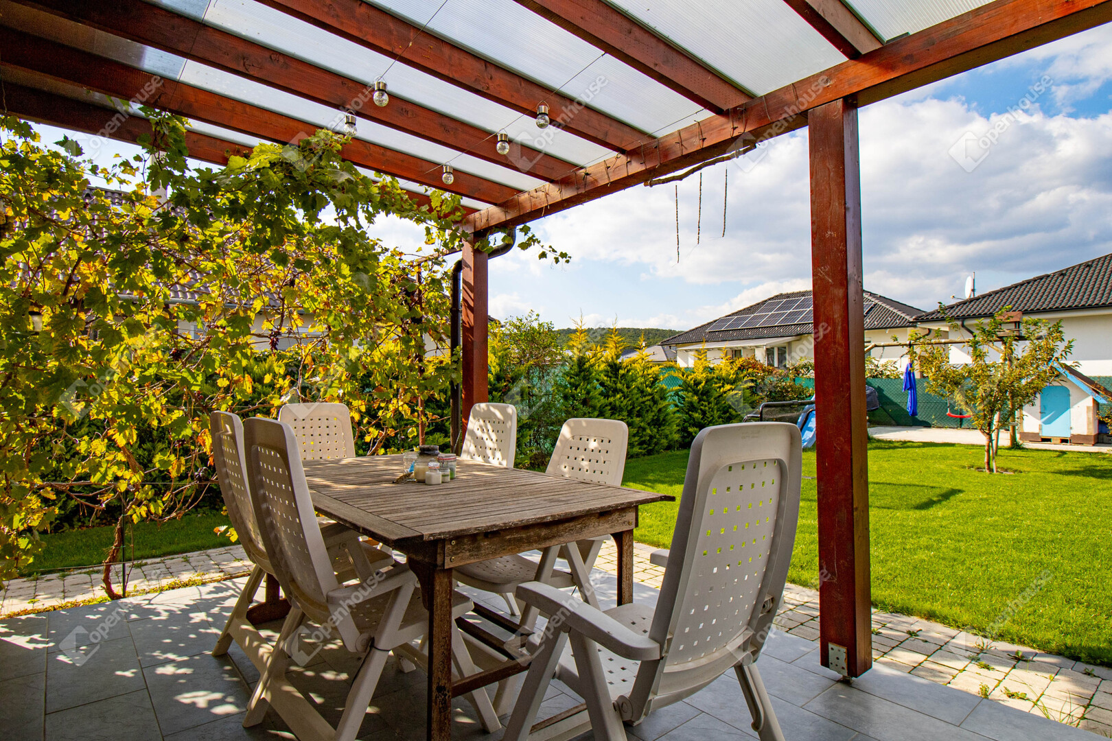Az otthon központi eleme a naplementébe forduló fedett terasz.