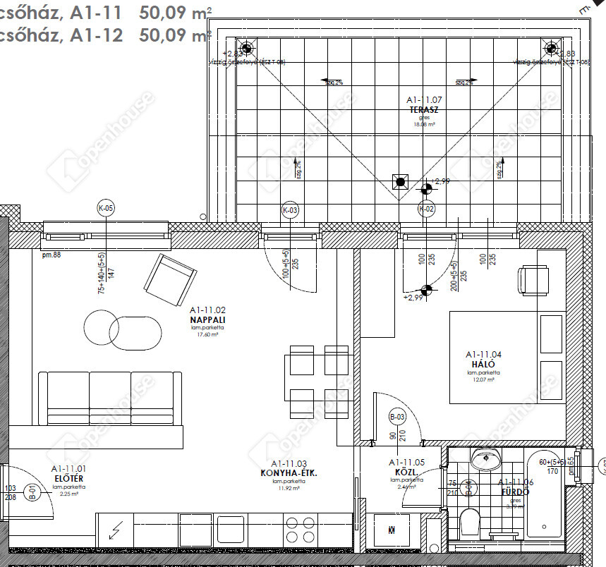 A1-11 jelű lakás 50,09 m2 alapterületű, és egy 18,08 m2 erkély tartozik hozzá