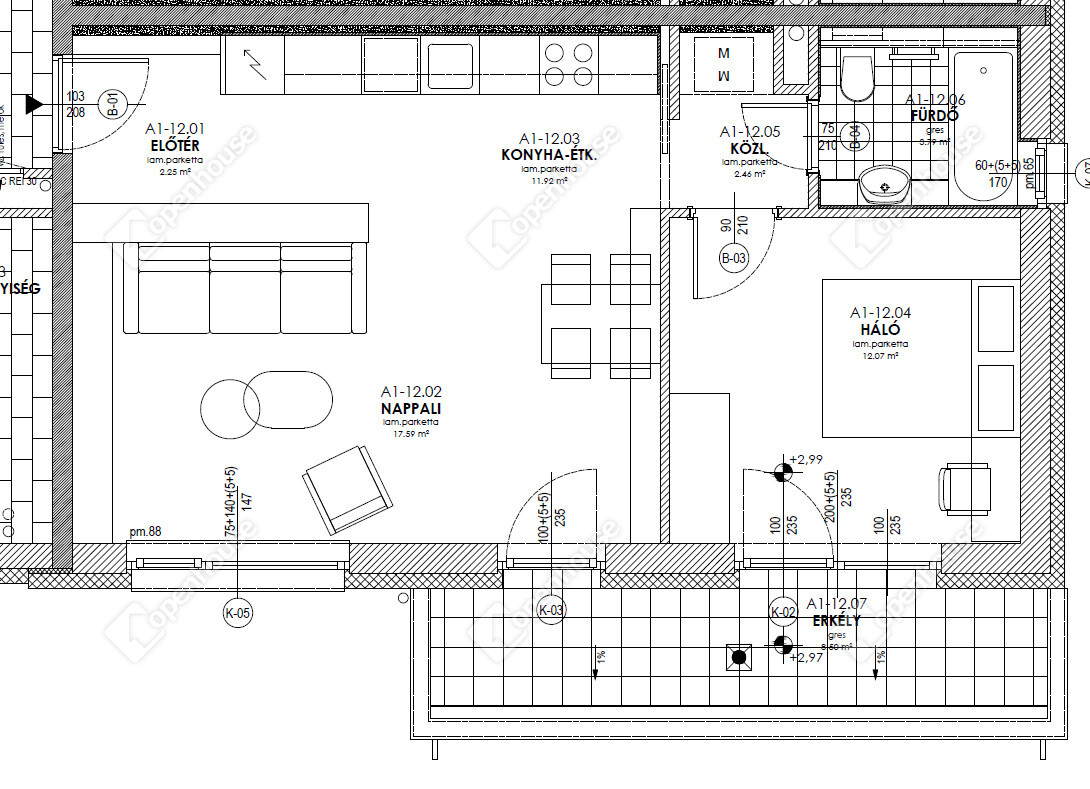 A1-12 jelű lakás 50,09 m2 alapterületű, és egy 8,5 m2 erkély tartozik hozzá