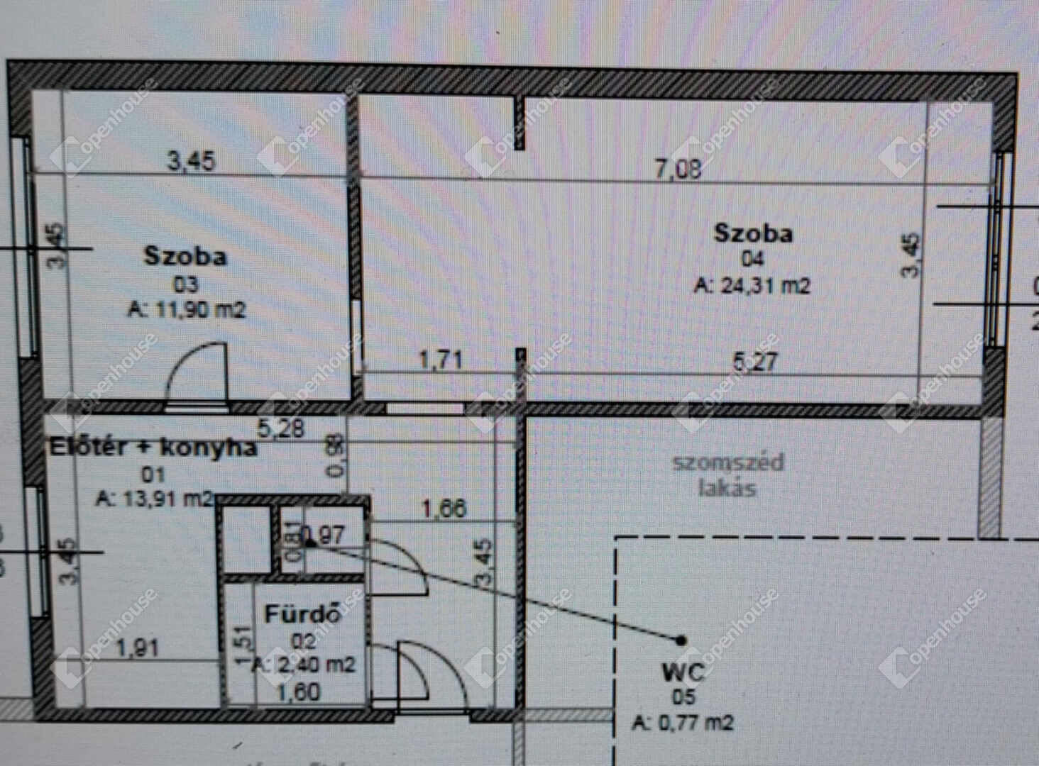 Az ingatlan elosztása: nappali + hall, szoba, közlekedő, konyha, fürdőszoba és különálló WC.