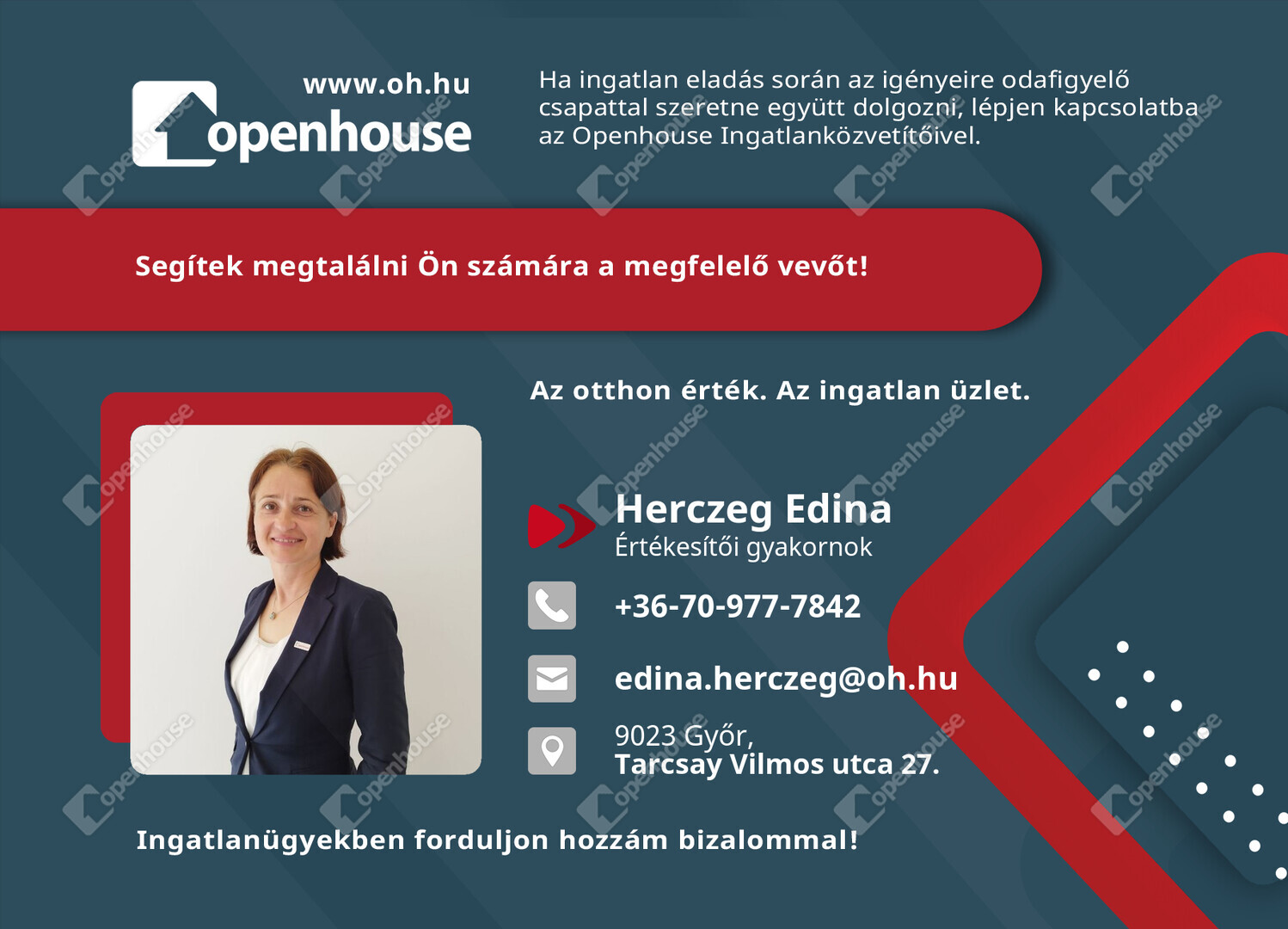 Az Openhouse Győr - Belváros Ingatlaniroda tagjaként várom Önt az országos hálózatunk teljes kínálatával.