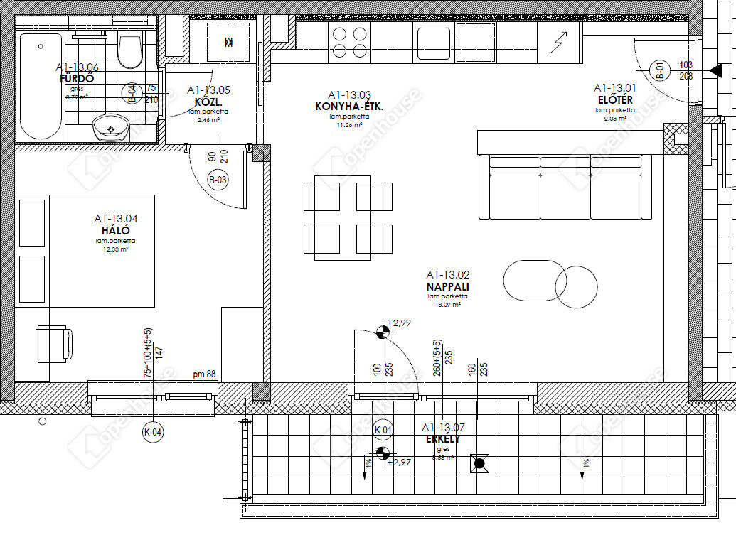 A1-13 jelű lakás 49,66 m2 alapterületű, és egy 8,58 m2 erkély tartozik hozzá