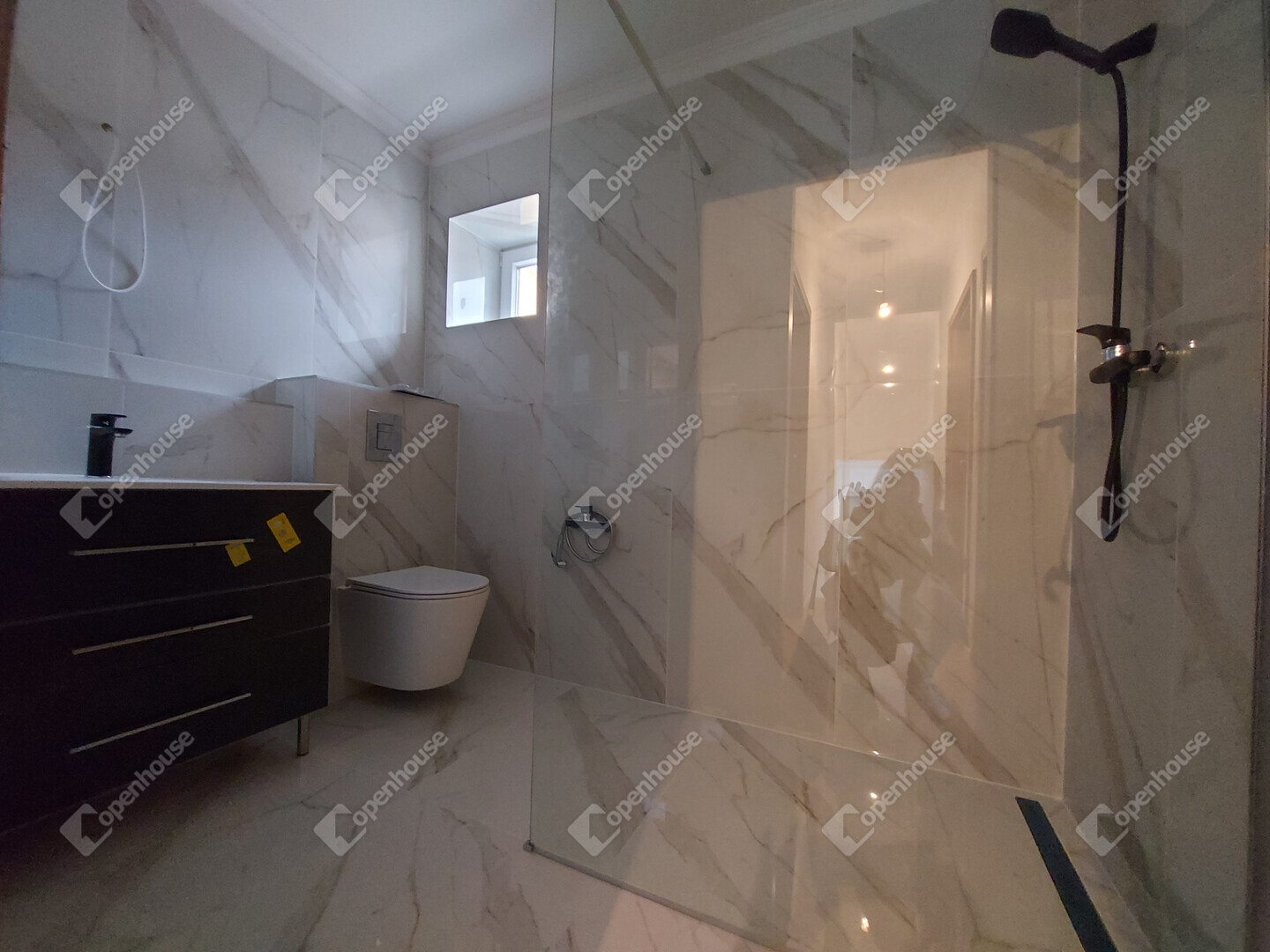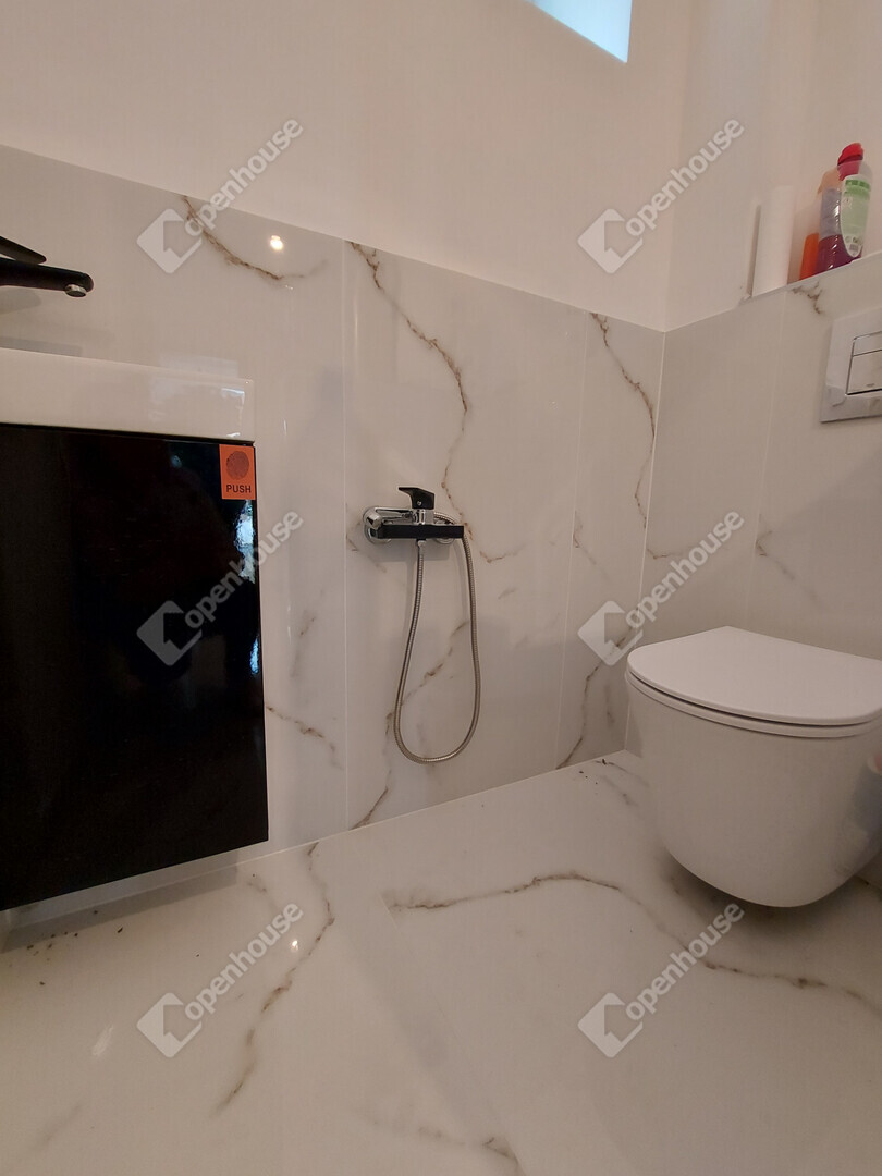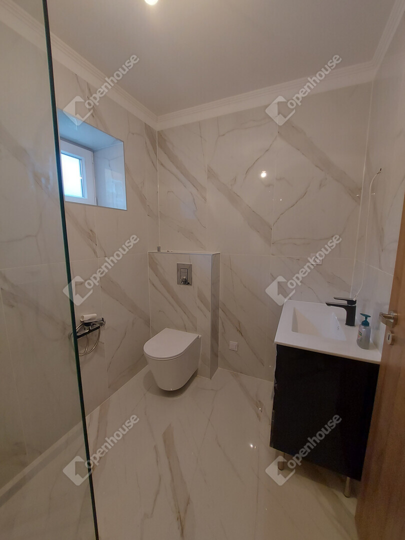 az alsó szinten külön WC kézmosóval található, míg az emeleten két fürdőszoba került kialakításra, amelyek közül az egyik közvetlenül a szülői hálószobához kapcsolódik, így valódi privát lakrészt biztosít.