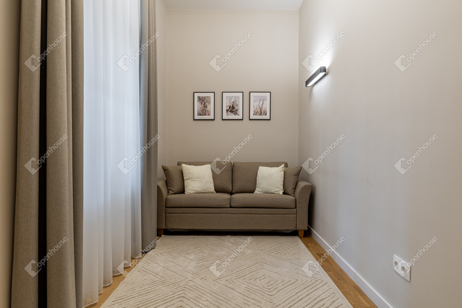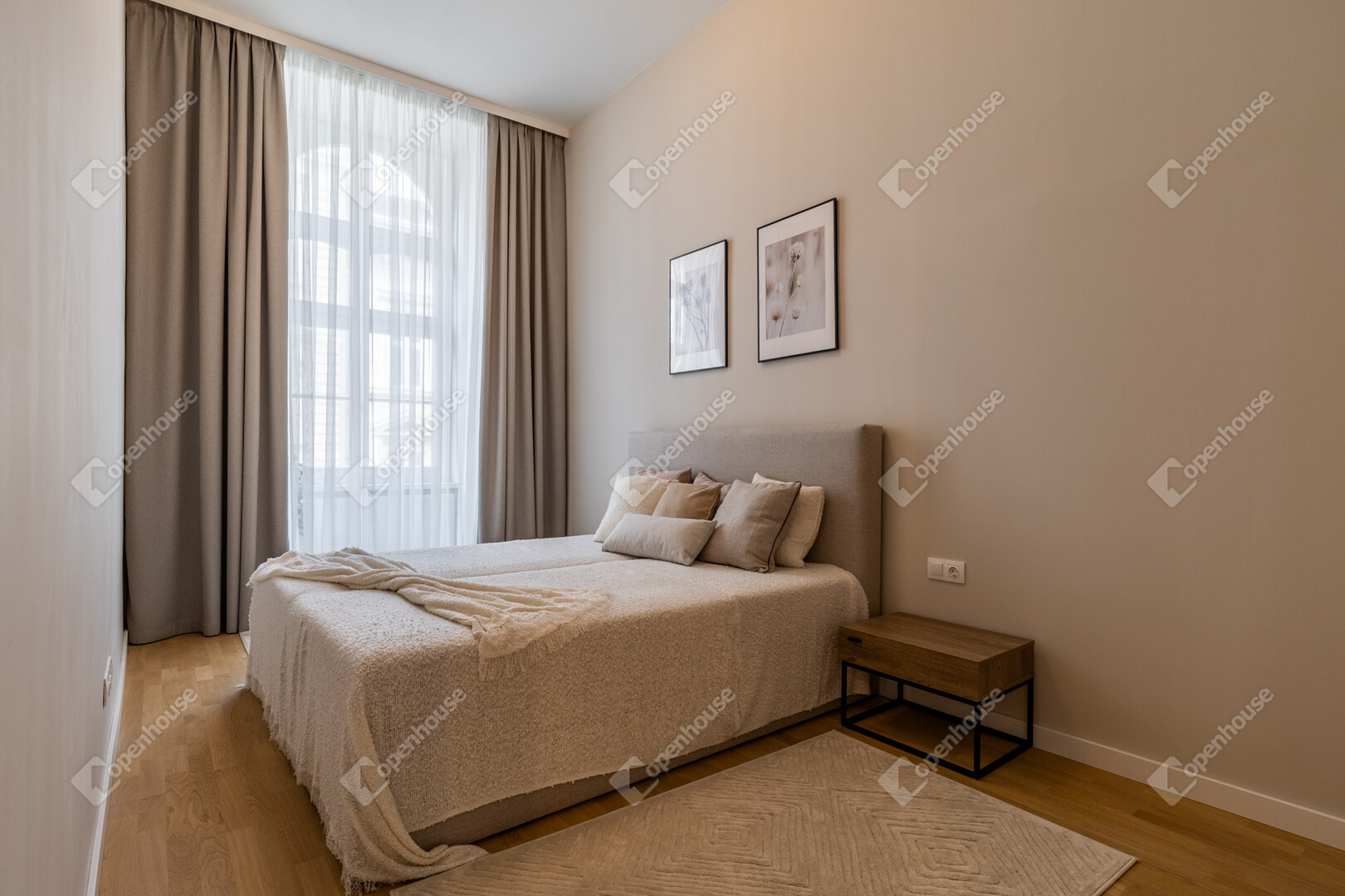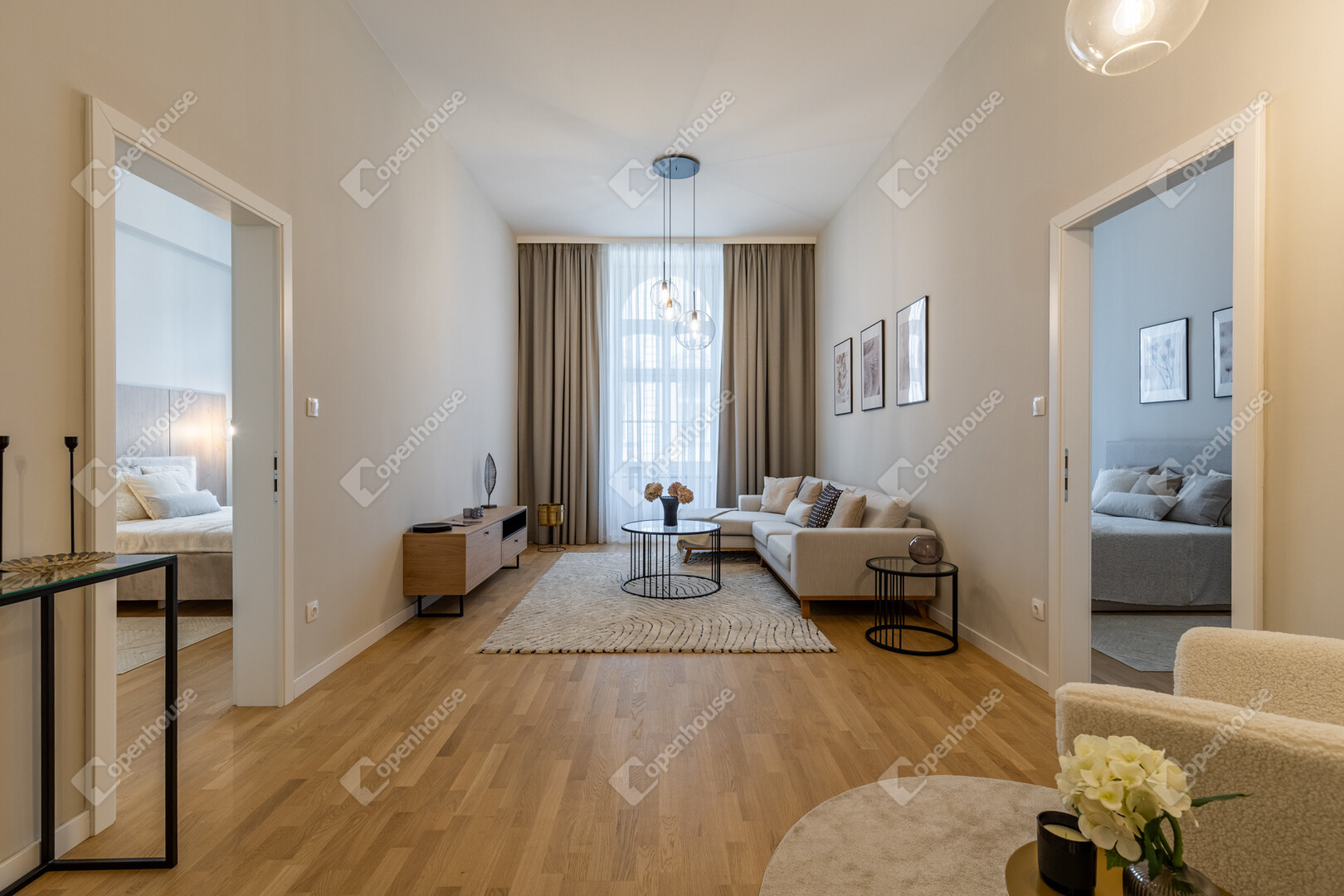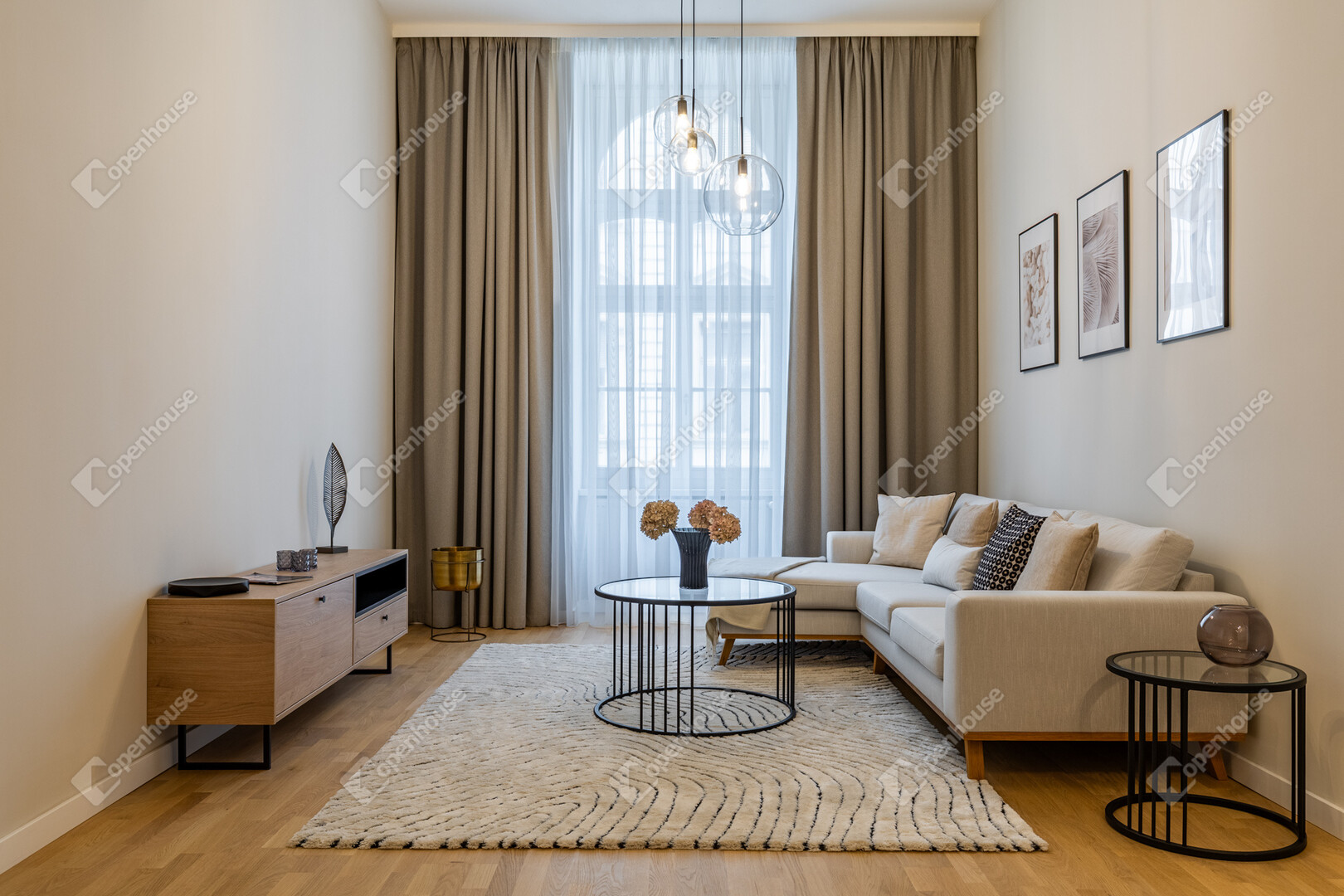 Az utcára néző ablakokból minden nap a belváros gazdagon díszített homlokzatai tárulnak fel. Ez a látvány folyamatos párbeszédet teremt a lakás modern, letisztult belső világával: a klasszikus polgári építészet részletei és a kortárs design tiszta vonalai együttese ad különleges élményt, amely egyszerre idézi meg a múlt értékeit és a jelen kifinomultságát.