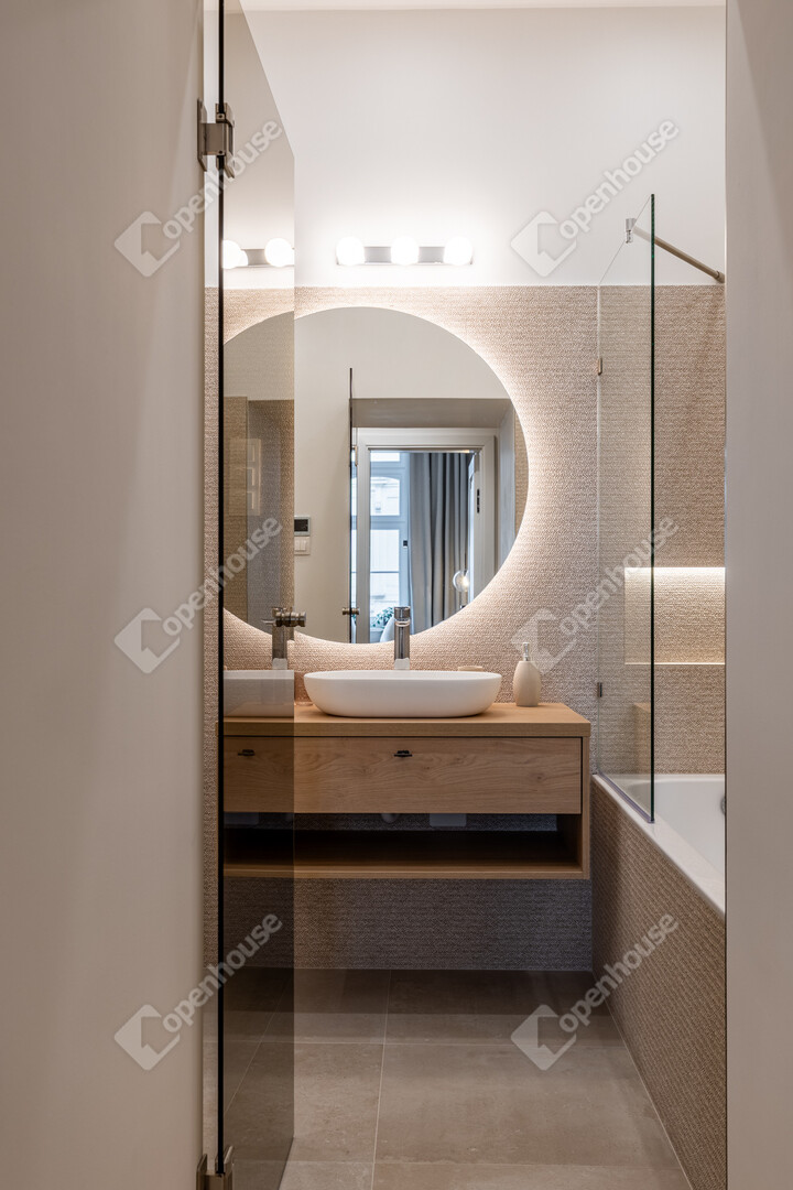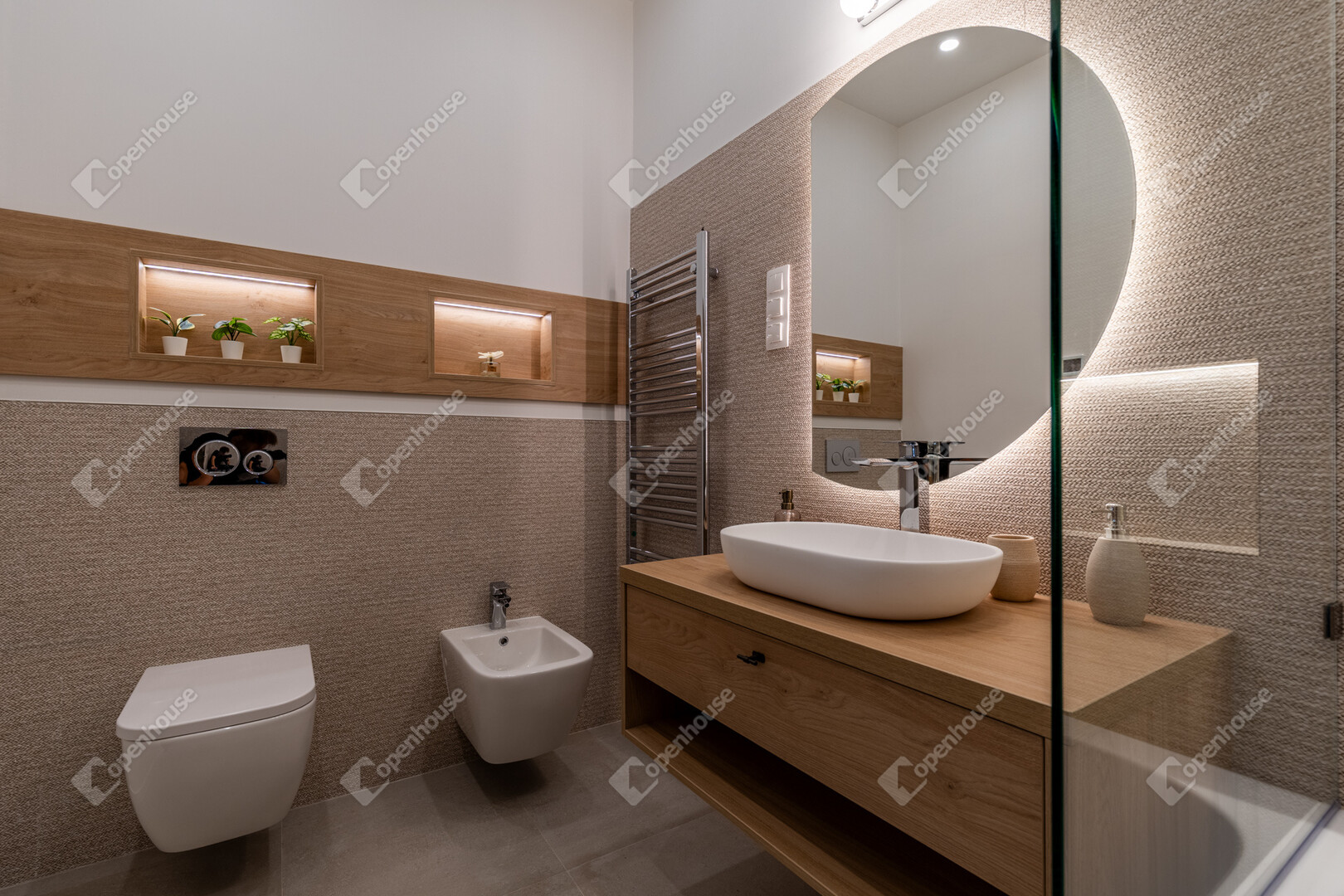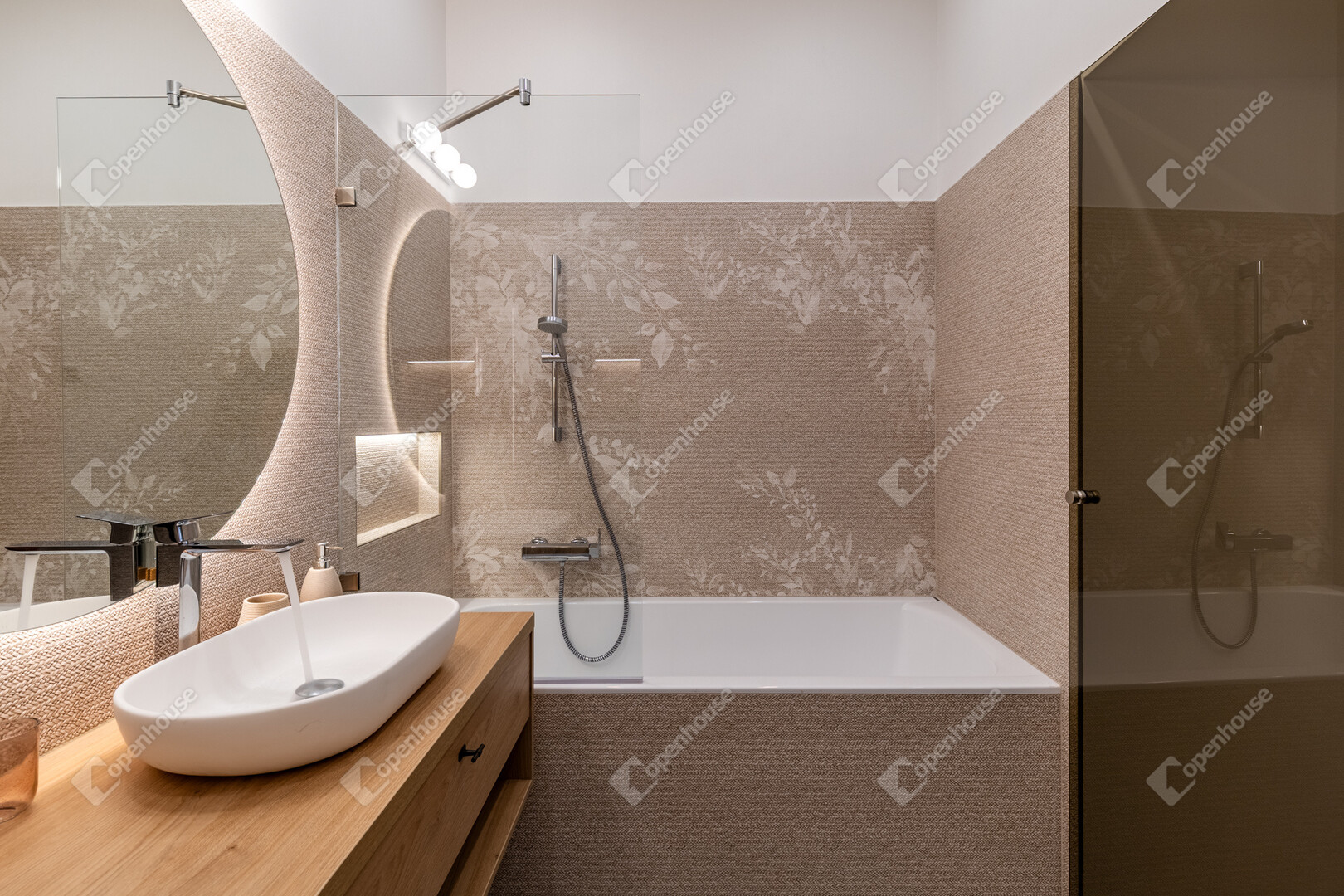 The two bathrooms feature Italian tiles, modern fixtures, and LED lighting — one with a bathtub, the other with a walk-in shower — providing the highest level of comfort.